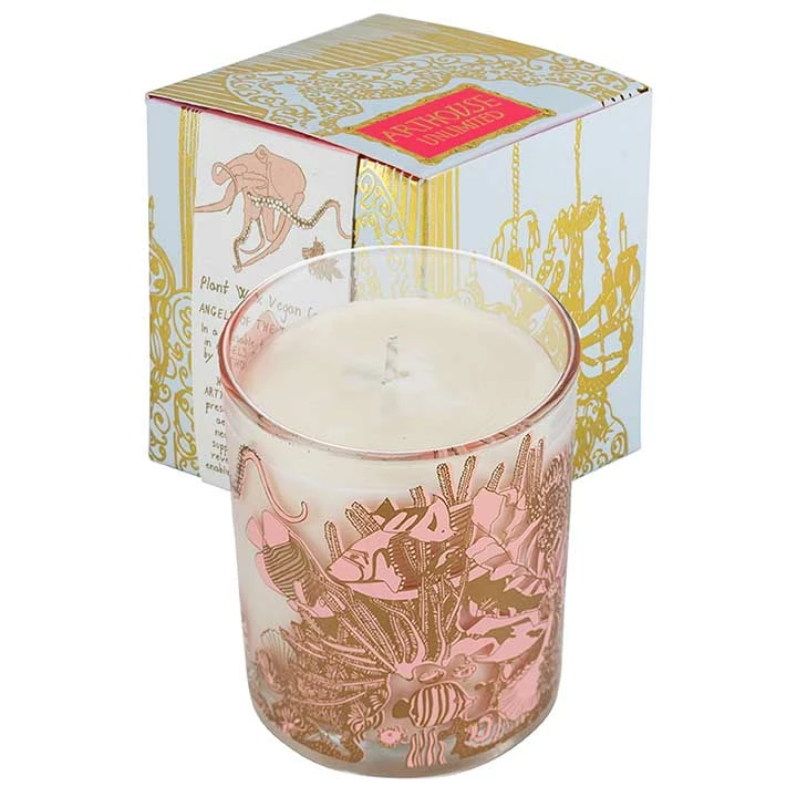 This vegan plant wax candle has been specially made in the UK for ARTHOUSE Unlimited, and has no animal or paraffin-derived ingredients. The beautifully adorned glass casing is completely reusable. Once you’ve finished burning the candle, just clean thoroughly and it can be used as a beautiful glass or vase. This candle features artwork created by a collaboration of ARTHOUSE Unlimited artists.