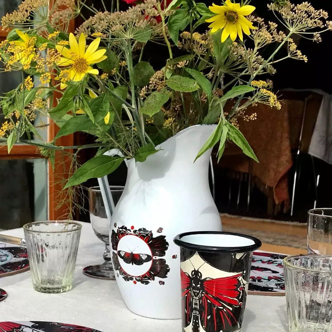A four pint capacity jug to be used for water or a vase. White enamelware with a detailed illustration of a moth. An everyday item becomes an heirloom. Â