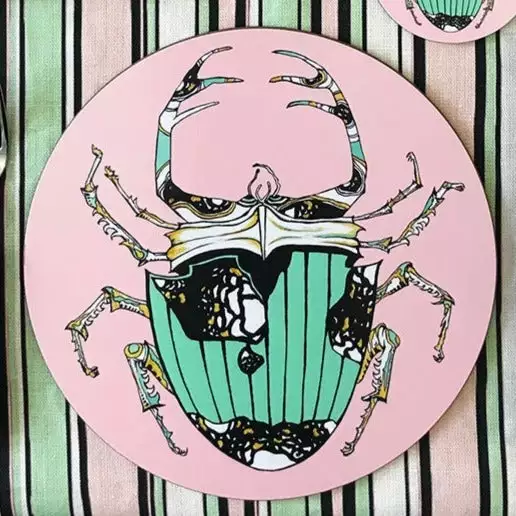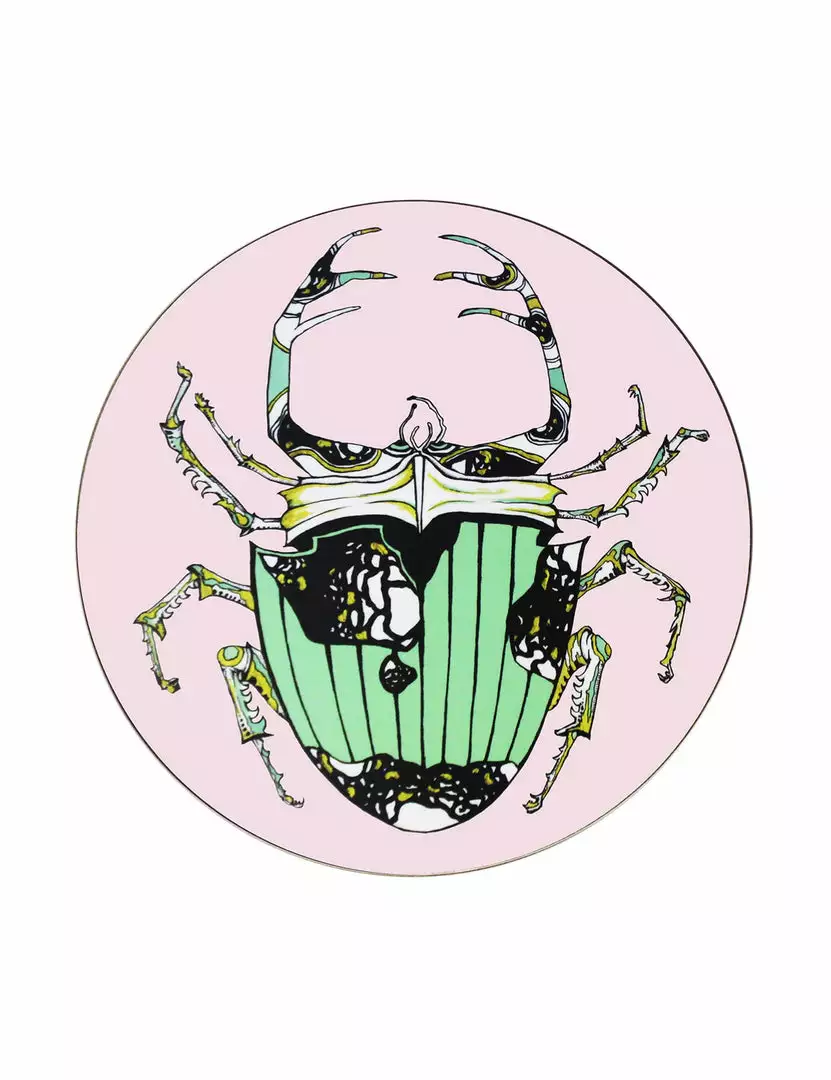 A beautifully illustrated melamine topped cork placemat. A round base with a pink background colour, black and lime beetle artwork. Sold individually with matching coasters available for a dramatic and unique table scape.   Â