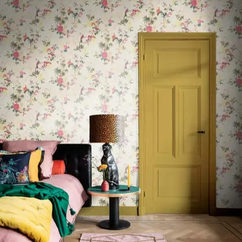 Exotic birds are scattered throughout a garden of colourful spring blossoms. Bang up to date with hot hits of neon accents and larger scale.Â