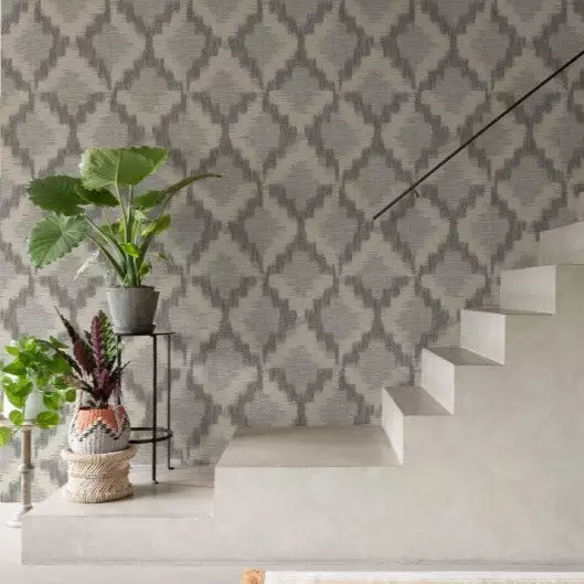 An large scale Ikat inspired weave print in earthy grass colour combinations. A matt surface with a textile feel. A great addition to a Bohemian, Farmhouse or Urban look interior.Â