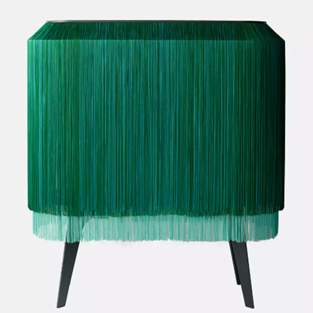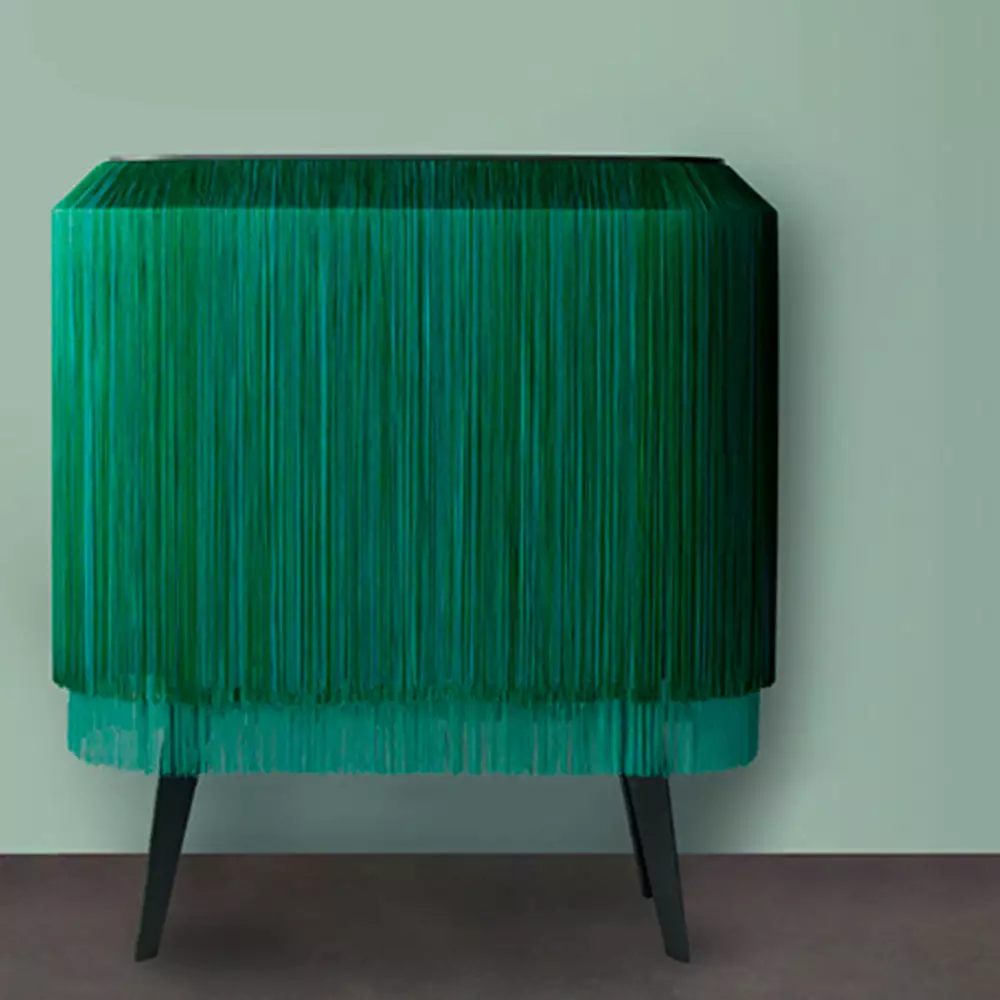 Half animal, half vegetation, the presence of this Ibride piece of furniture is puzzling.  This mysterious piece of furniture, fringed on all sides, seems to breathe under its long silky coat, and one is surprised to touch it, to comb it, to slide one’s hand inside to discover what this cascade of fringes conceals.Â