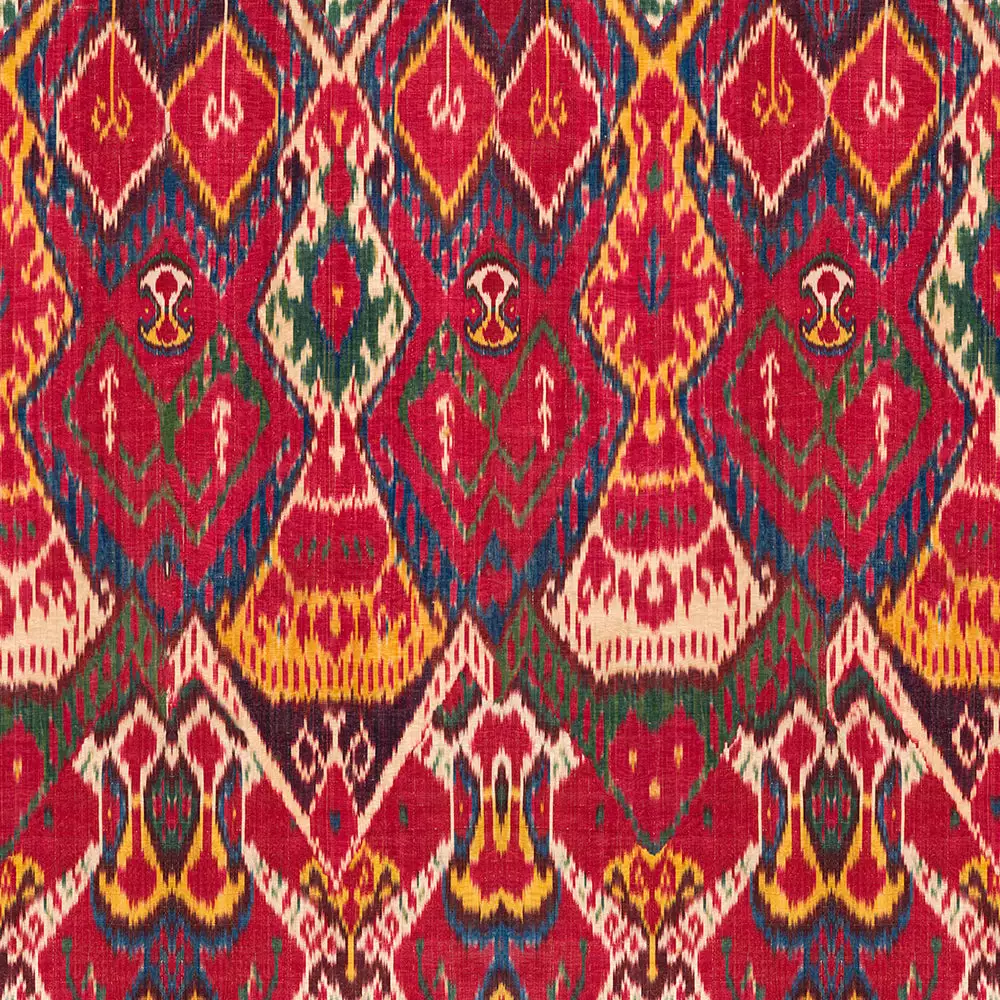A beautiful multicolour design inspired by traditional handwoven Uzbekistan Ikat silks. These bold kaleidoscopic patterns have been adopted into the modern Farmhouse look adding a depth and weaving into our cultural psyche. Printed on a robust heavy weave linen.