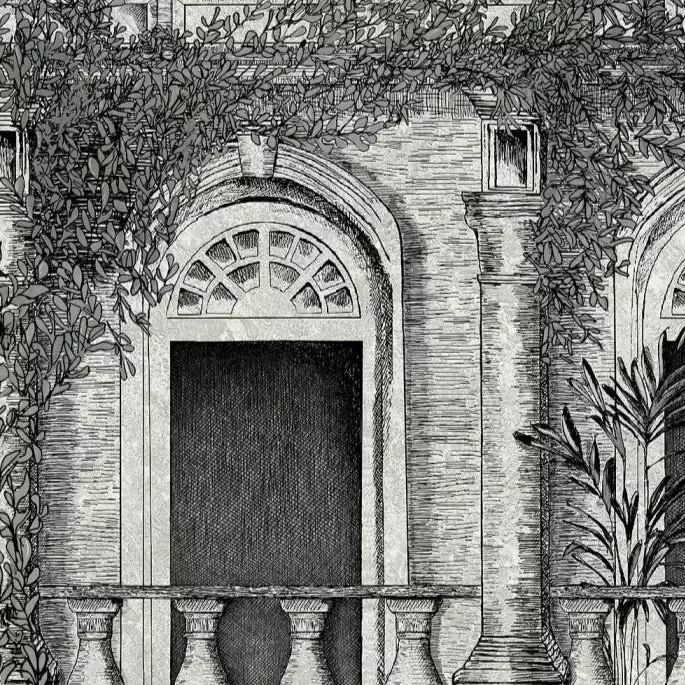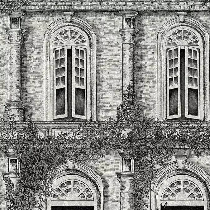 An amazing hand sketched drawing, demonstrating beautiful detail surrounding the doors and the windows of this architectural building with the growing foliage adding to the aura and stunning design created by Brand McKenzie.