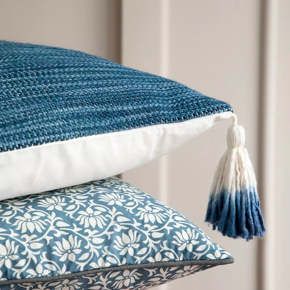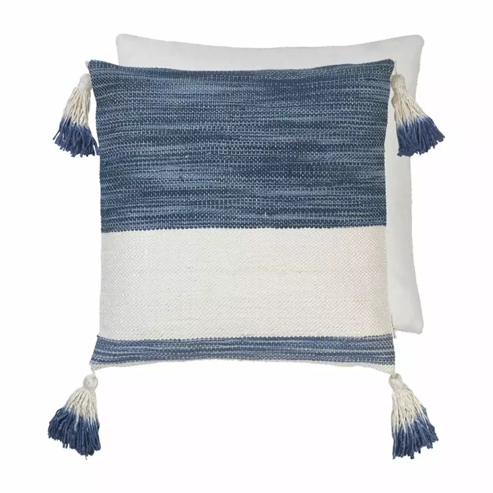 This artisan cushion with its chunky top weave has a rustic and tactile element. The indigo Ombre dip dye and tassels add extra interest. Boho dreams await. Elevate your bedding or use as a scatter cushion. Sold including the inner made of European duck & down feathers filling to ensure a firm and long lasting shape. Â