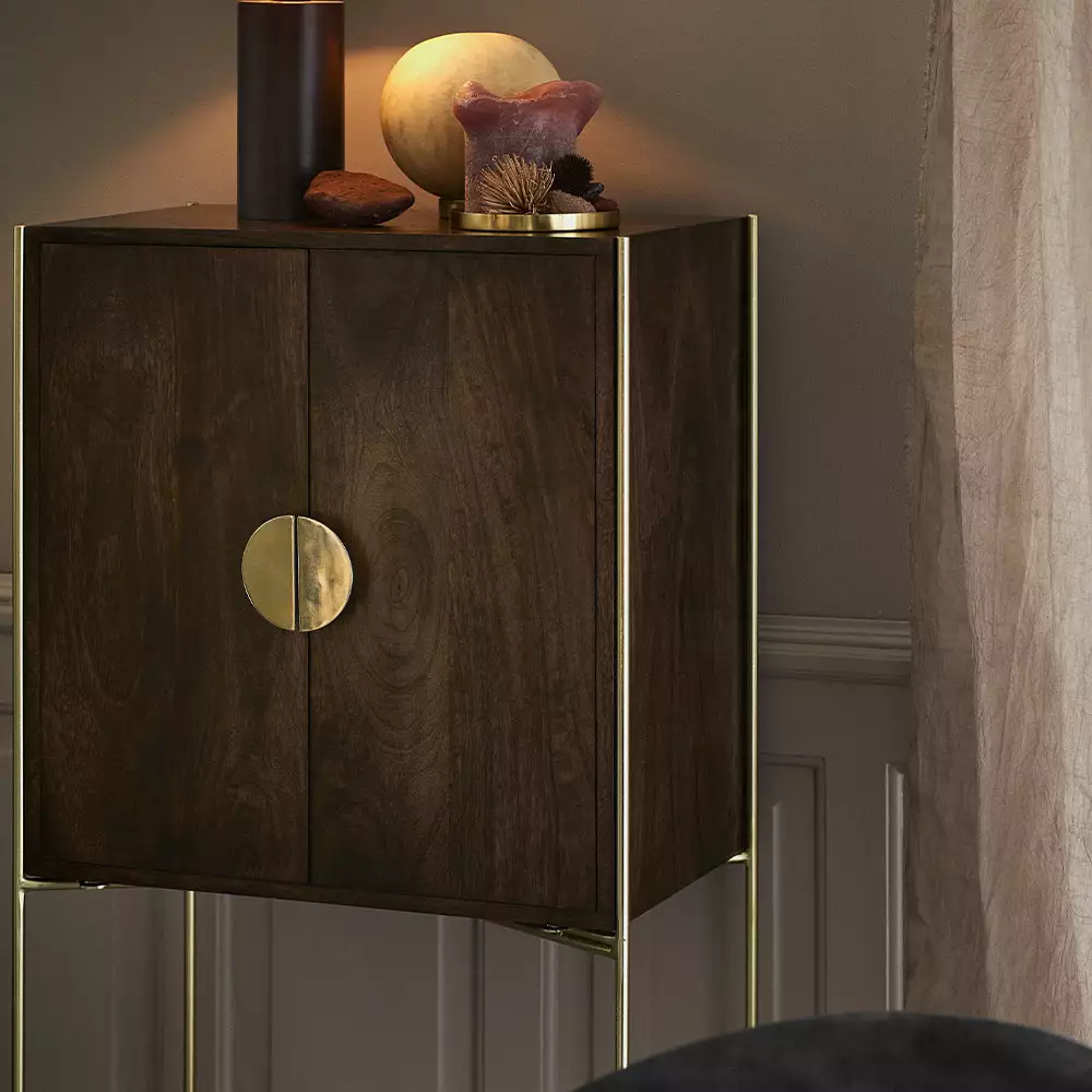 Cocktails couldn’t be classier. This beautiful Bar Cabinet is made from Mango wood with it’s warm tone and feel . Strong and sleek with a modern aesthetic, rich brown tones are accented by vintage antique brass effect hardware. Clean and classic lines, this piece will stand the test of time. A perfect item for THE CRAFTSMAN look or THE REVIVAL feel. Â