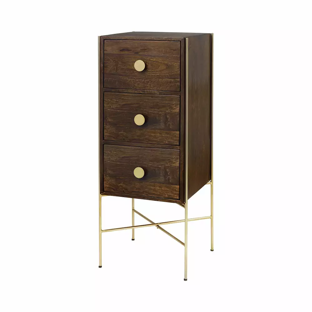 This beautiful chest of drawers is made from Mango wood with its warm tone and feel . Strong and sleek with a modern aesthetic, rich brown tones are accented by a vintage antique brass effect hardware. Clean and classic lines, this piece will stand the test of time. A perfect item for THE CRAFTSMAN look or THE REVIVAL feel. Â Â Â