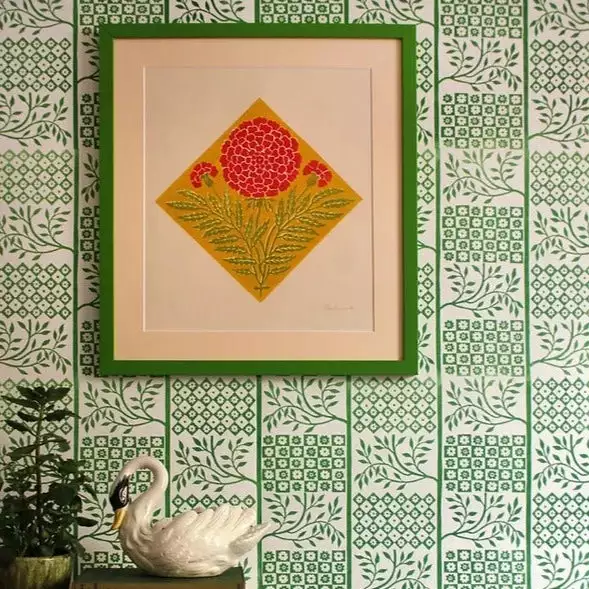 Checker-Tree has been hand drawn and carved by Ellen. This wallpaper is printed to order on Ellen’s vintage printing press in her London studio. Colours are matched by eye creating an authentic block print bespoke effect.