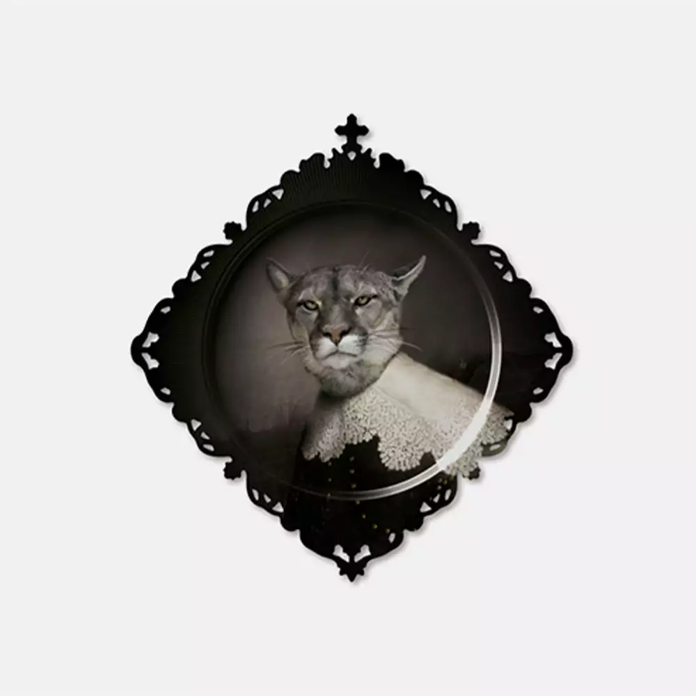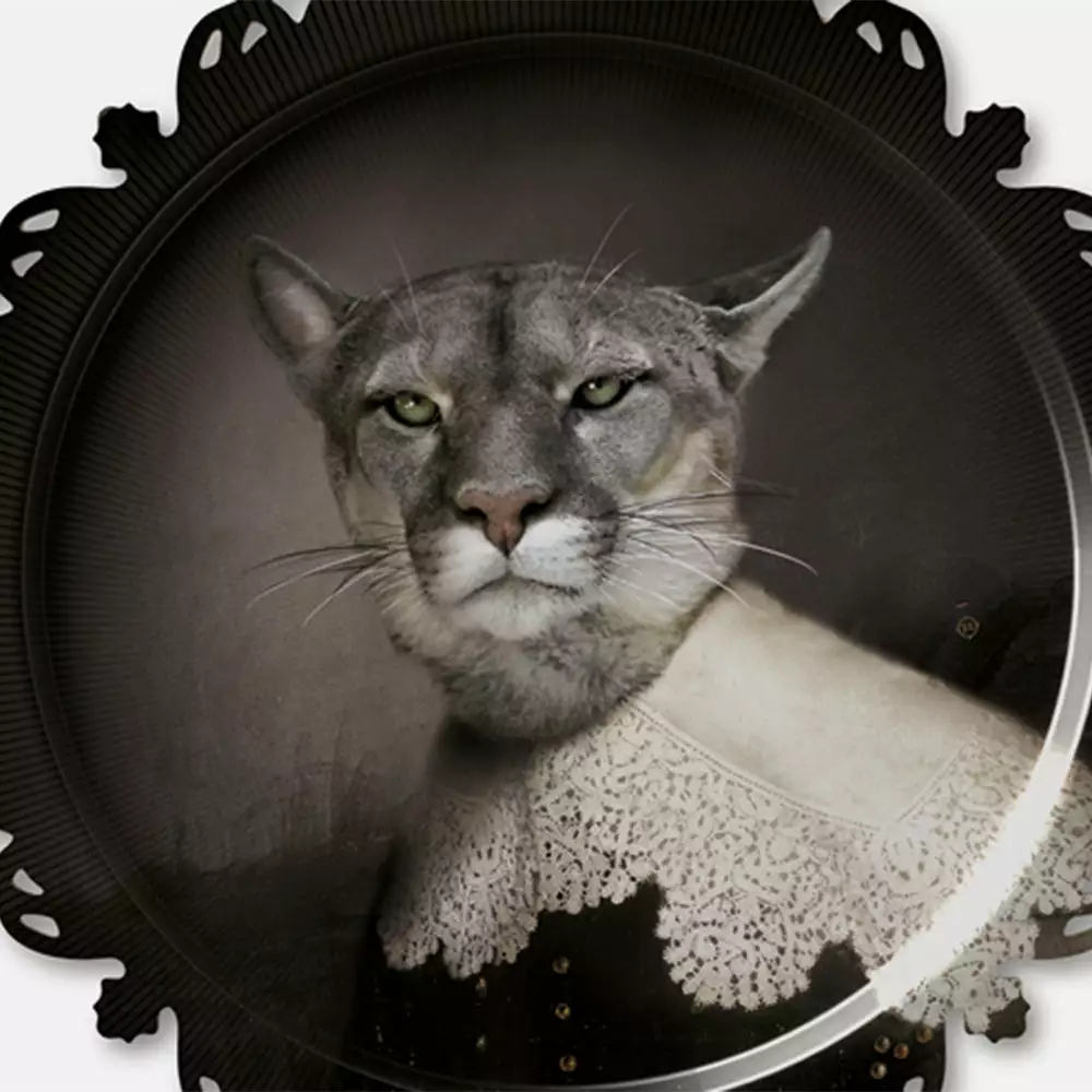 Urbin, Margot’s imaginary husband, takes the shape of a jaguar, just like his sovereign, as an expression of his lineage’s power and perspective. The animal, a personality of stately demeanor, imposes himself as visionary master, a guardian of her century’s influence.