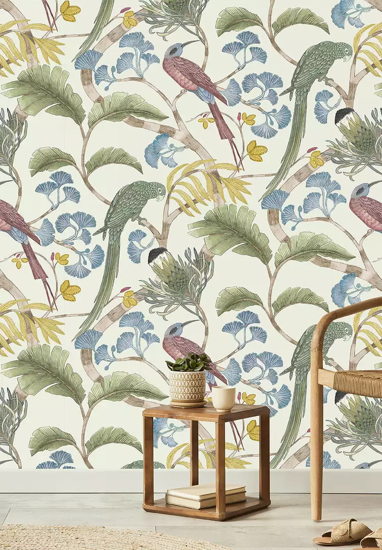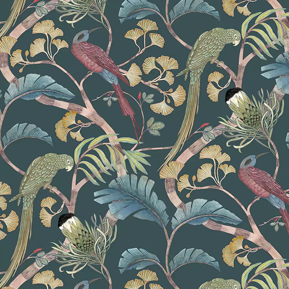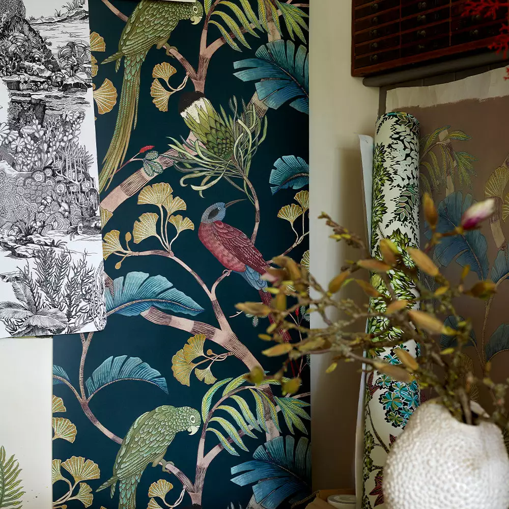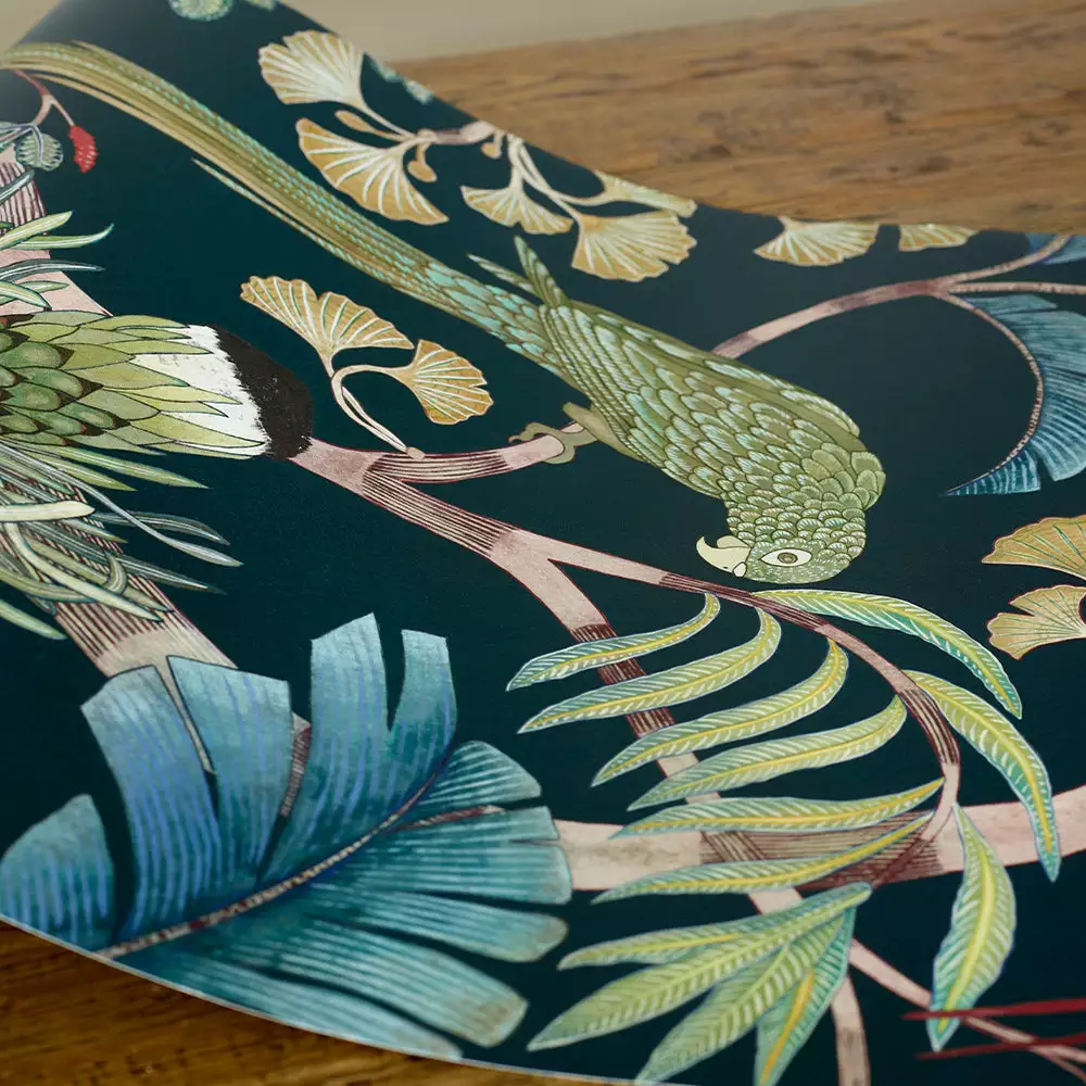 A hand painted tree full of exotic avifauna and flora. Parakeets and sunbirds nestle in the branches, surrounded by lush ginkgo leaves and protea blooms. Hand painted to create movement that will gently meander down your wall. Available in moody dark navy, and softer tones.