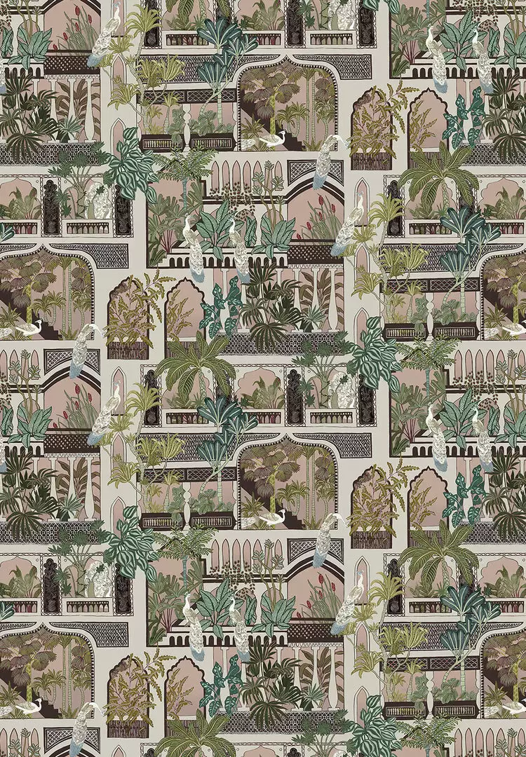 This wallpaper design was inspired by Indian architecture. It is bought to life with lush foliage and playful peacocks. This pattern has traditional geometric pattern set in architectural Doorways and Windows. All meticulously hand painted.