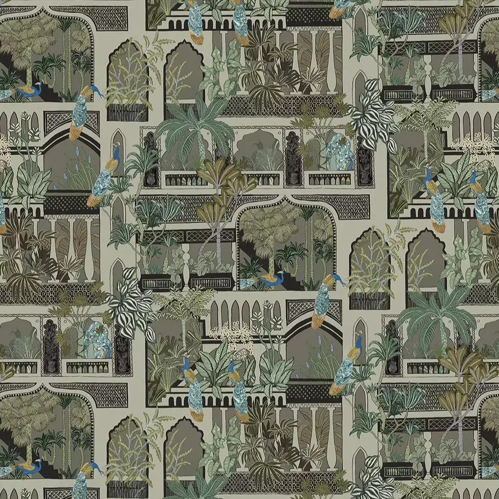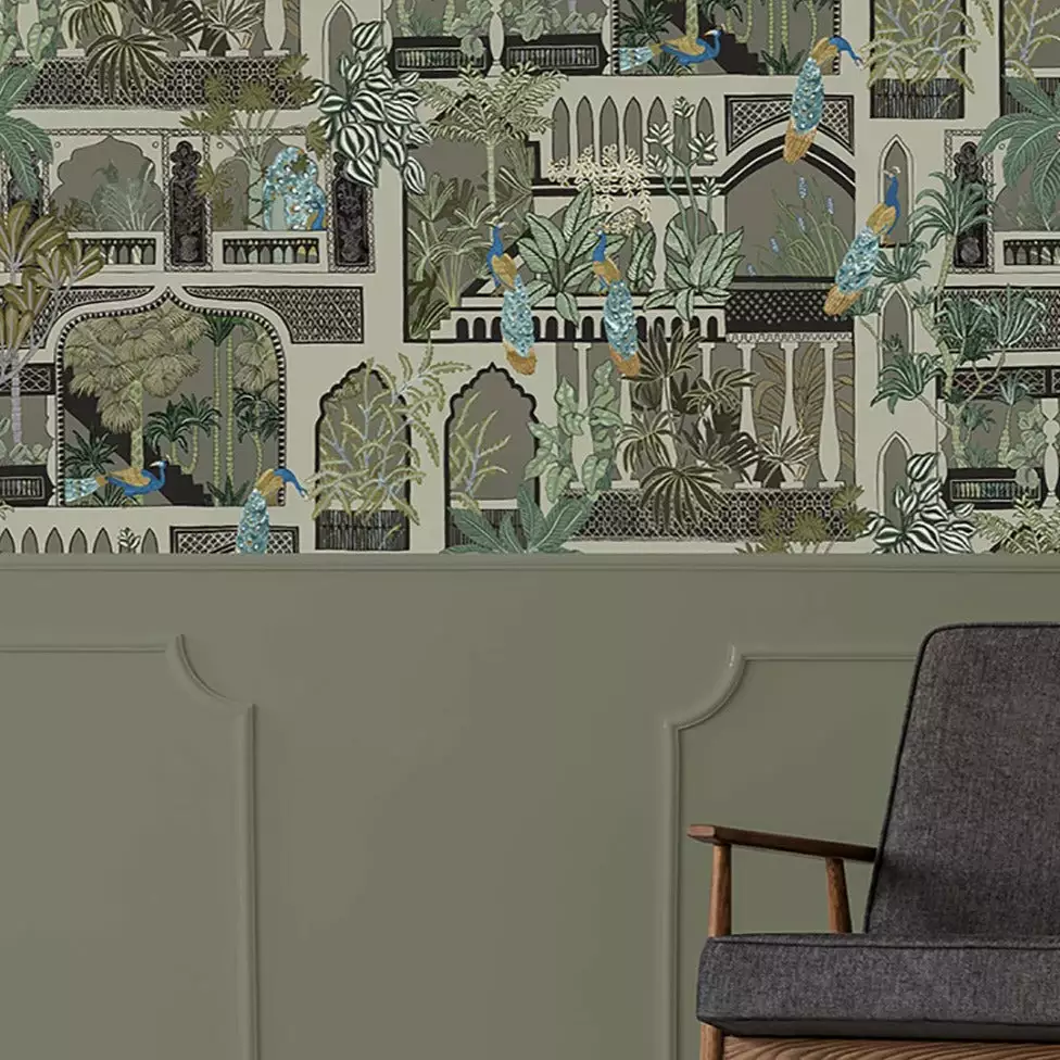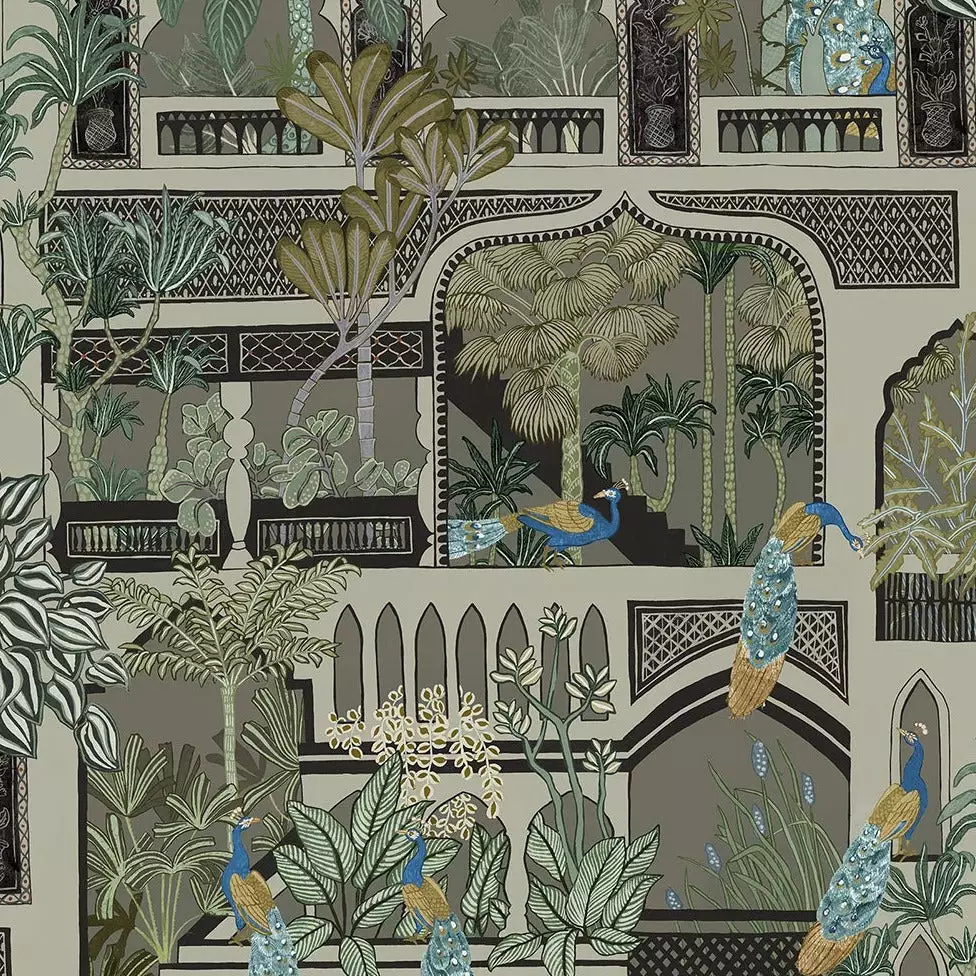 This wallpaper design was inspired by Indian architecture. It is bought to life with lush foliage and playful peacocks. This pattern has traditional geometric pattern set in architectural Doorways and Windows. All meticulously hand painted.