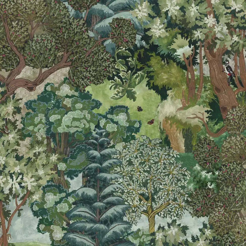 Here Josephine tells us more about this design. Miserden is a beautiful Estate in the Cotswolds. Josephine painted arches and walls along with trees including an ancient Mulberry tree that is believed to have been planted in 1620. A huge piece of intricately painted leaves and animals. Miserden comes in a large scale pattern or a smaller repeating roll.