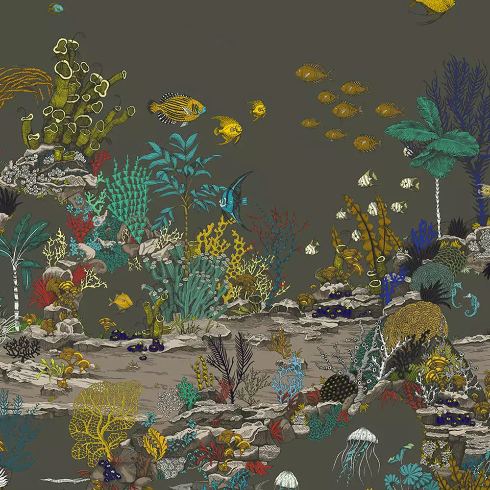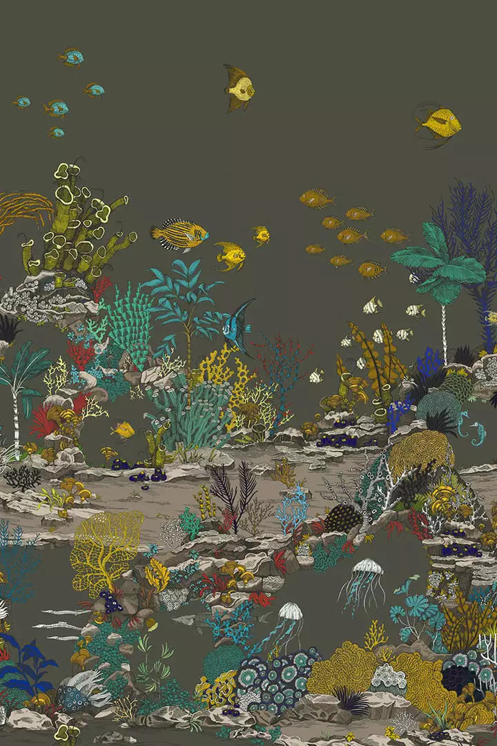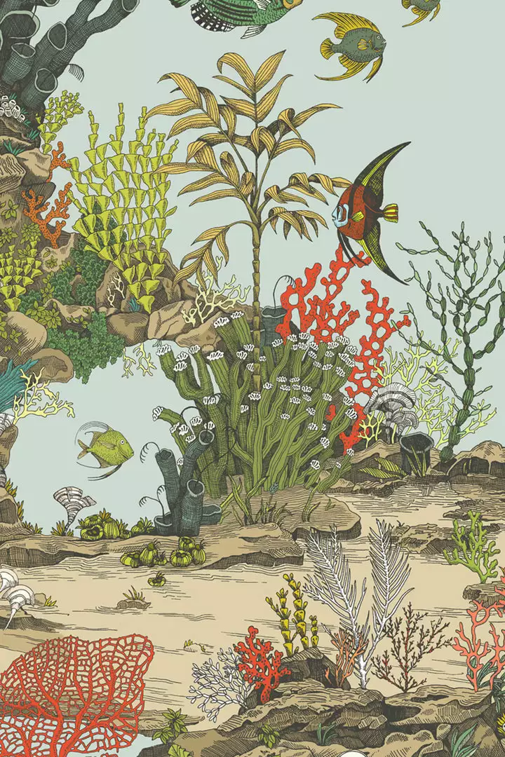 This wallpaper design was inspired by a trip to Belize. Underwater and on-shore vegetation blurred into one. As my drawings progressed, this magical underwater jungle slowly appeared.