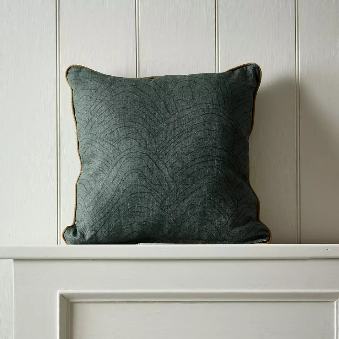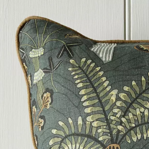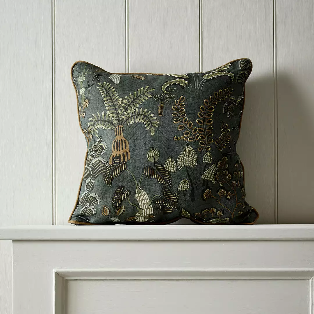 Inspired by a local woodland. Ferns unfold at your feet and mushrooms spill out of tree stumps creating a carpet of interest. Each element was captured, and hand painted. Piping detail and concealed zip.Â