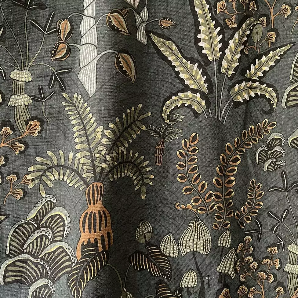 Inspired by a local woodland. Ferns unfold at your feet and mushrooms spill out of tree stumps creating a carpet of interest. Each element was captured, and hand painted.