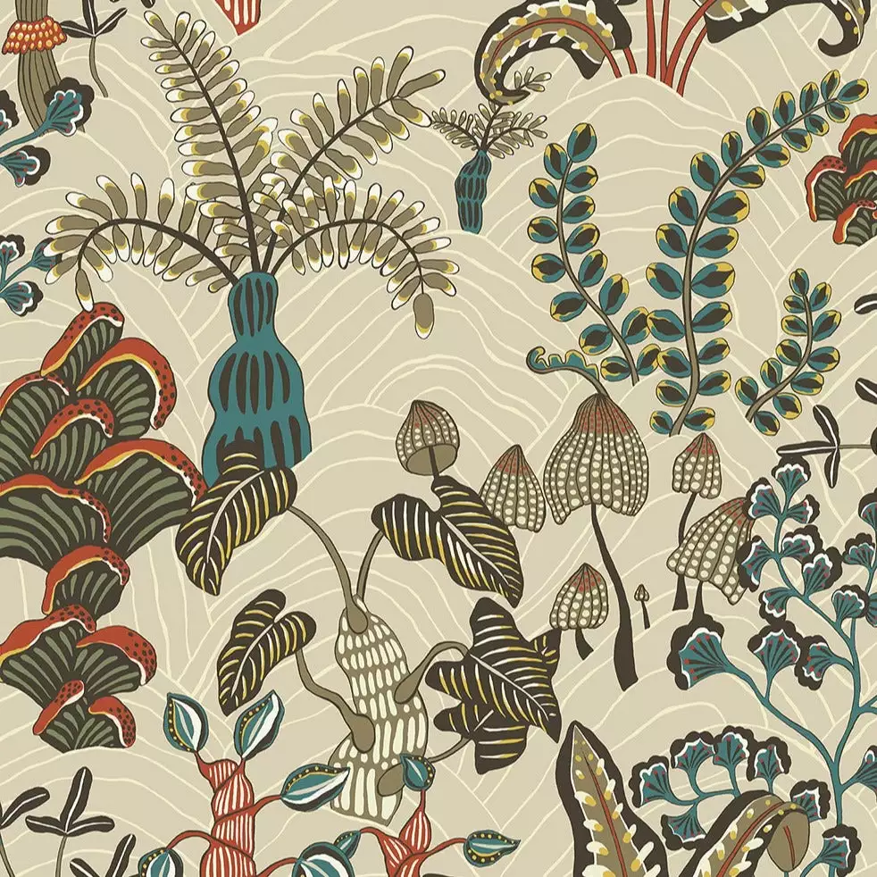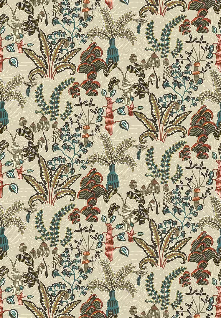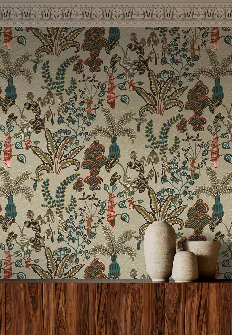 Inspired by a local woodland. Ferns unfold at your feet and mushrooms spill out of tree stumps creating a carpet of interest. Each element was captured, and hand painted.