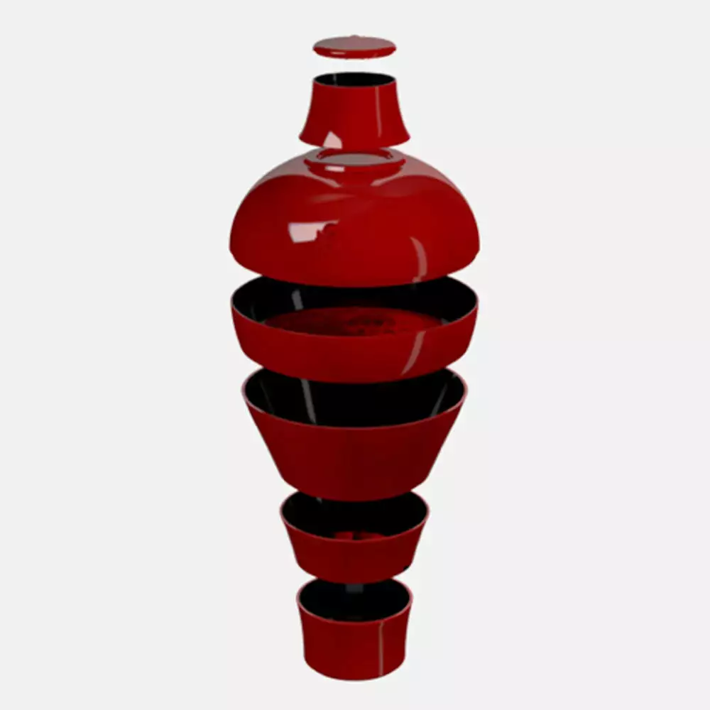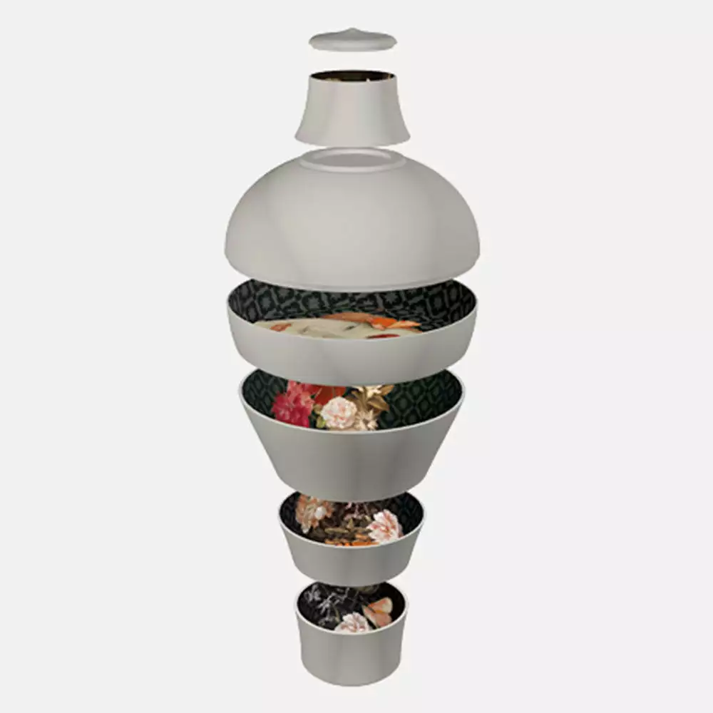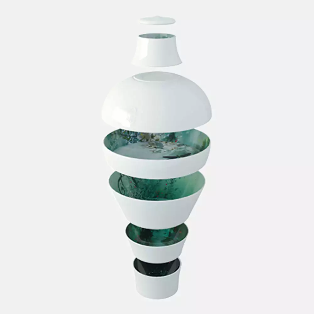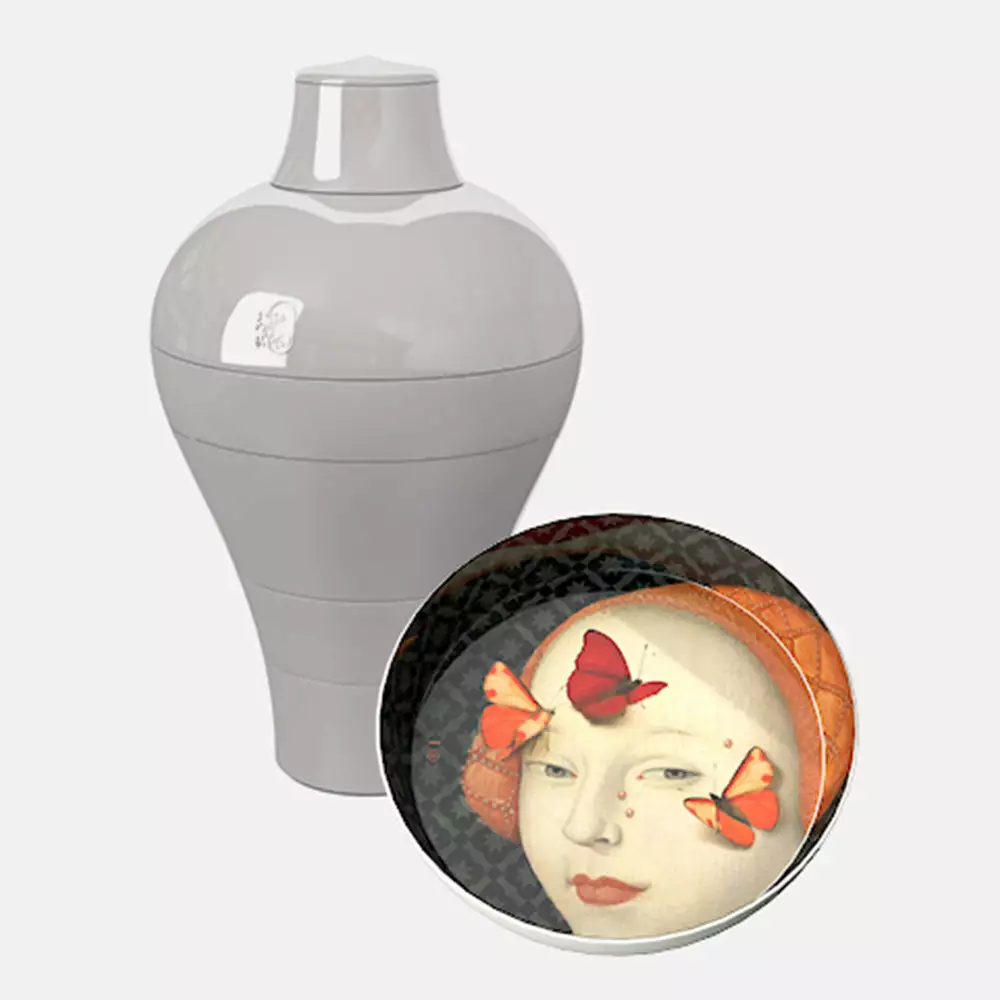 Its clean shape pays tribute to the well-known eponymous Asian vase, but its graphic content is quite another story…Â