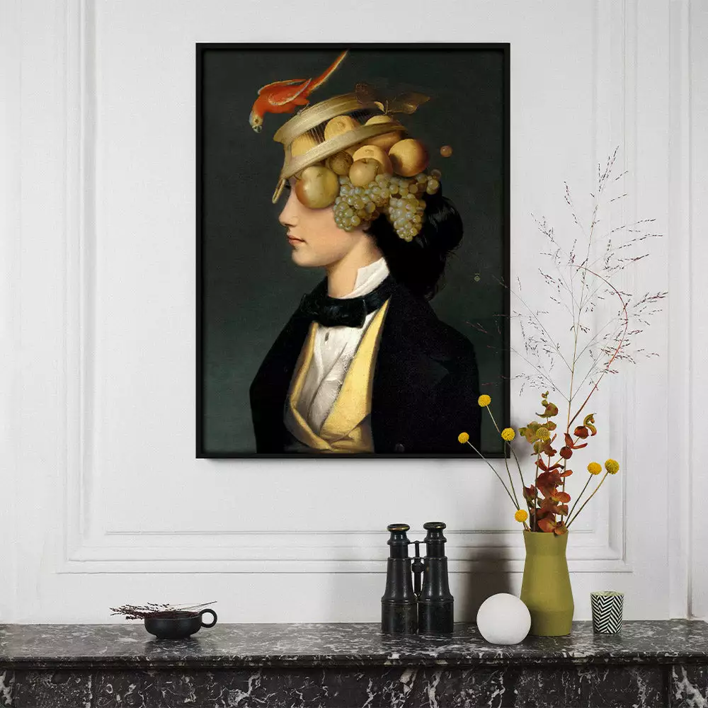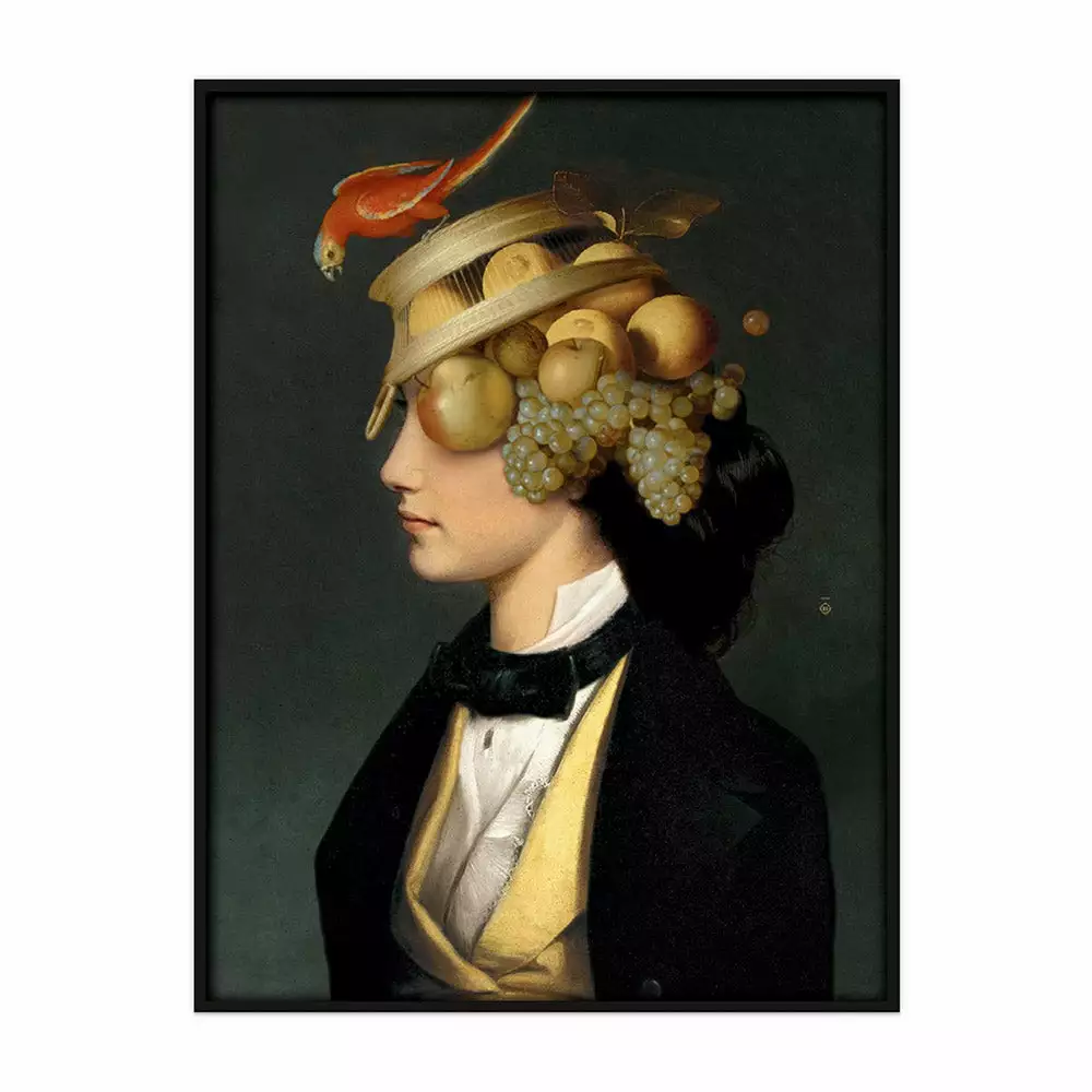 Edmee masked and with a glowing red headdress, lets the unusual emerge in this 19th century neo-classical painting.