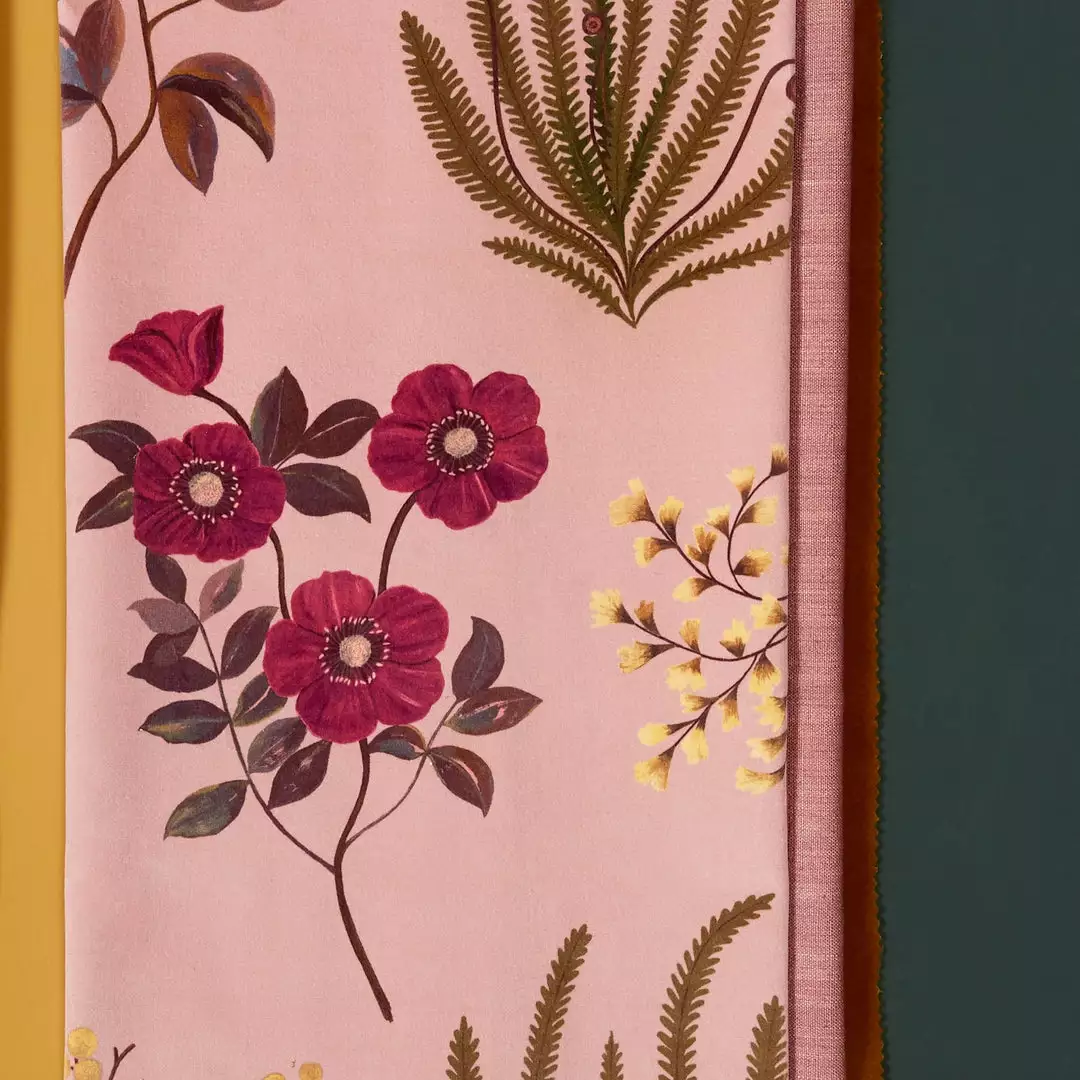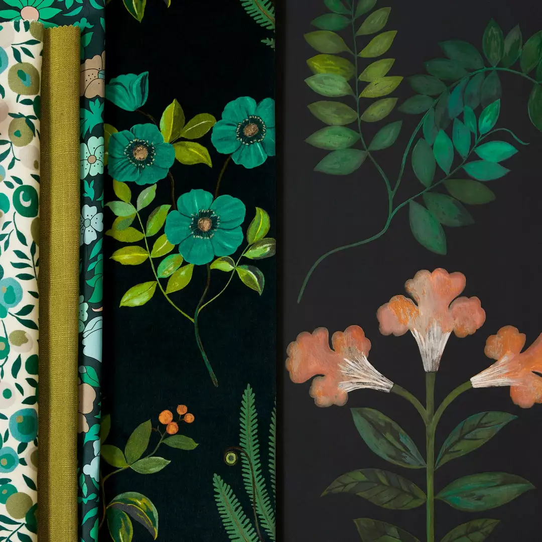 Hand-painted in the Liberty design studio, Botanical Flora is a hero artwork of the Floribunda story, celebrating the historic tradition of botanical illustration in Britain – featuring elegantly trailing flora such as dicentra spectabilis (bleeding heart) and lily-of-the-valley. Botanical Flora appears on cotton velvet, bringing to life the soft painterly nature of the motifs.
