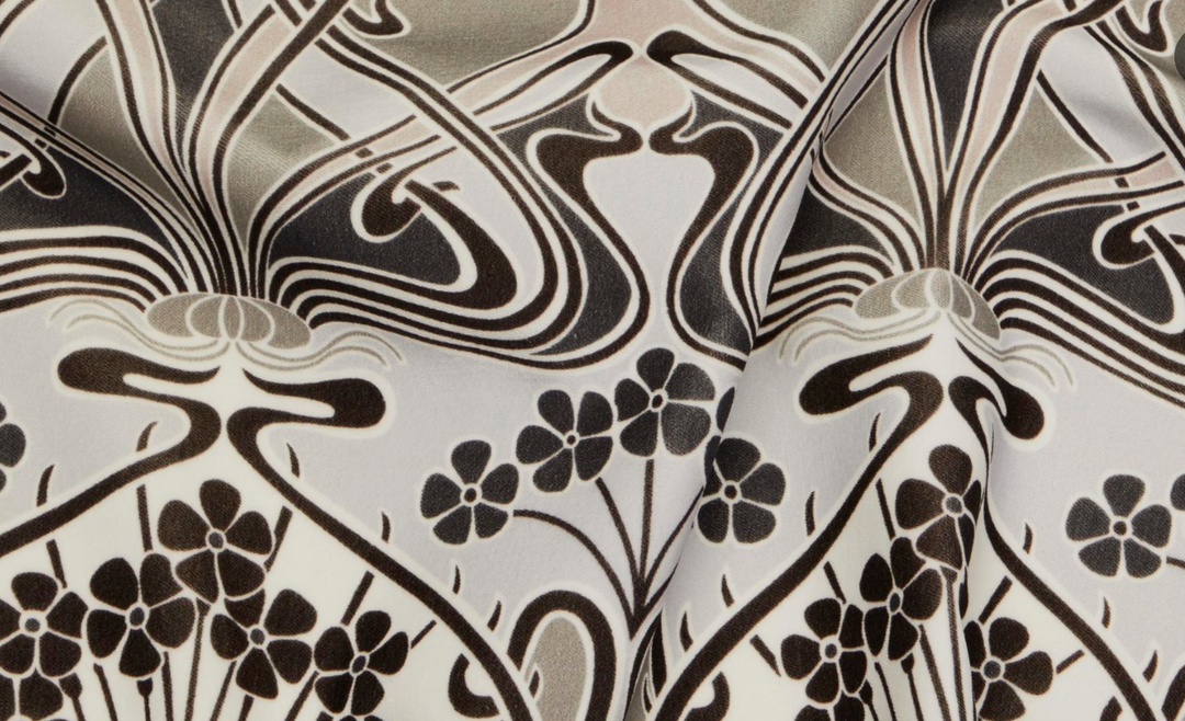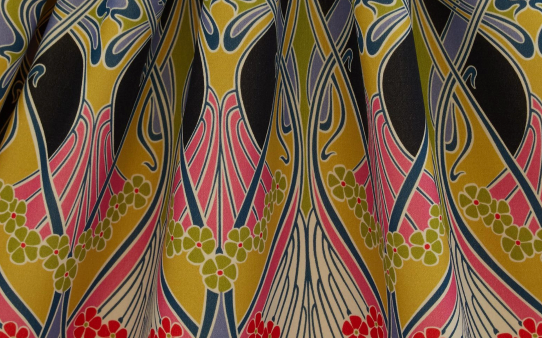 Designed by French artist R. Beauclair in c.1902 and first printed for Liberty in 1967, Ianthe is an iconic example of Art Nouveau design, with its highly stylised flowers arranged into a sinuous layout. It is expertly printed in Italy onto our cotton velvet – the perfect base for rich, saturated tones and bright colours, with a robust structure and exceptional abrasion rating that’s well-suited for high-traffic contract use. Its elegant drape also makes it ideal for heavier curtains with blackout or draft-excluding qualities.
