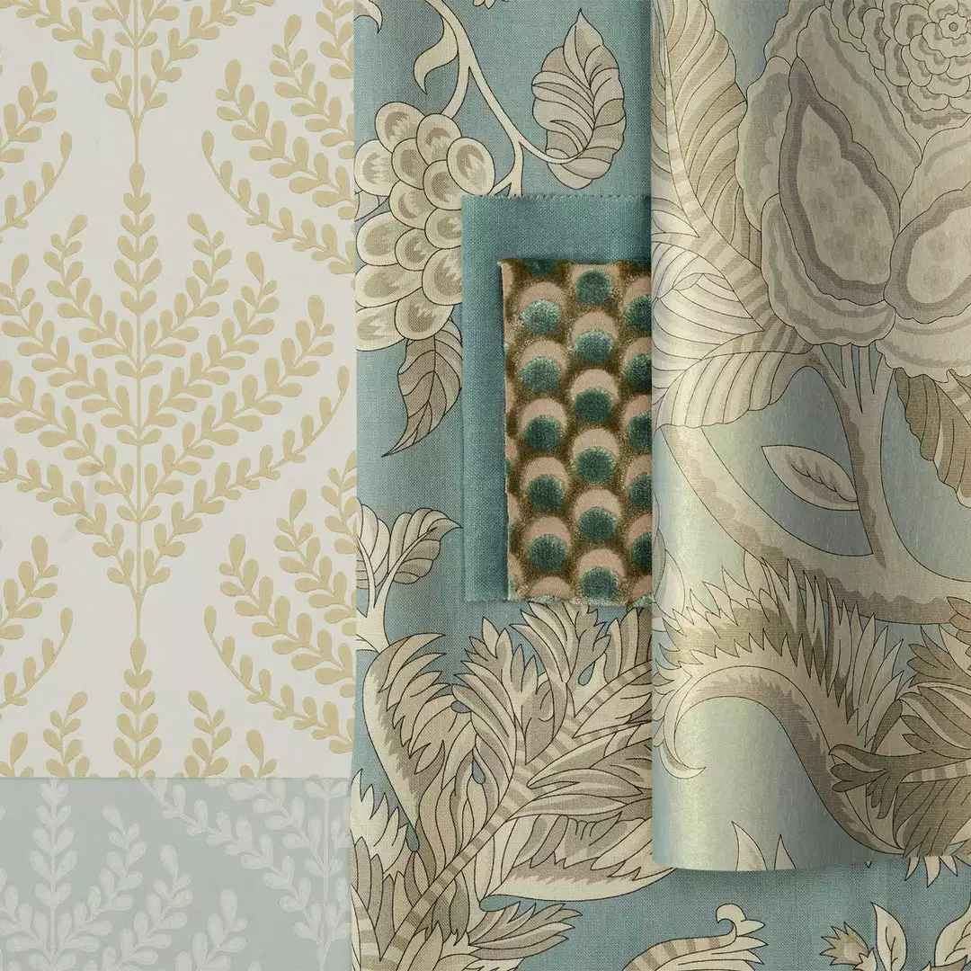 Paisley Fern, the Liberty design studio drew motifs from the fern-like fronds within our Patricia artwork, to create a simple and elegant coordinating design which provides space and light within the collection. It is printed using a mix of matte and mica pigments to provide soft lustre and depth – rendered in ointment pink and soft gold, pewter grey and down, pale jade and soft fennel yellow.