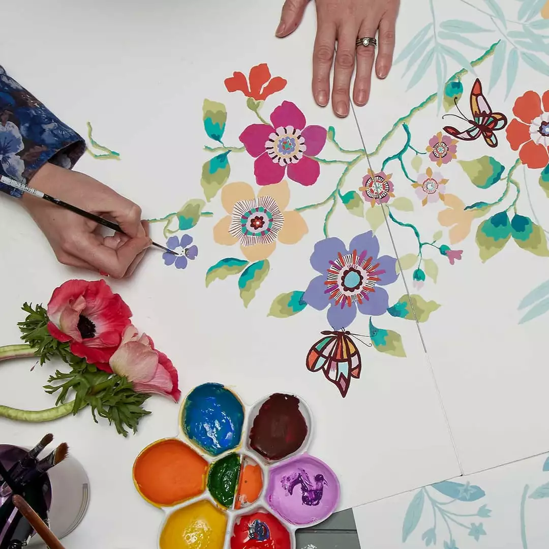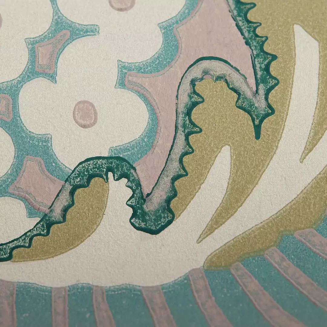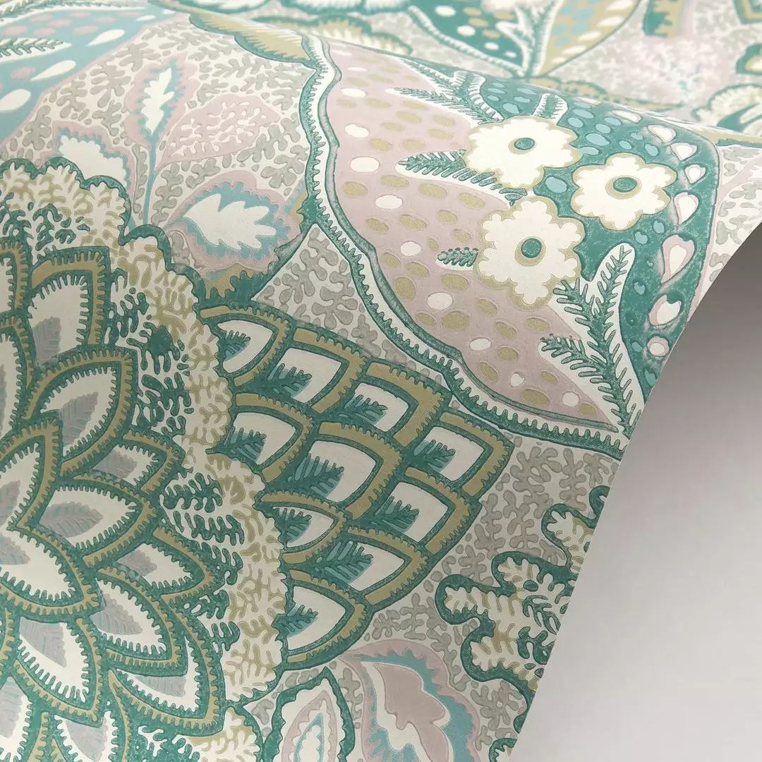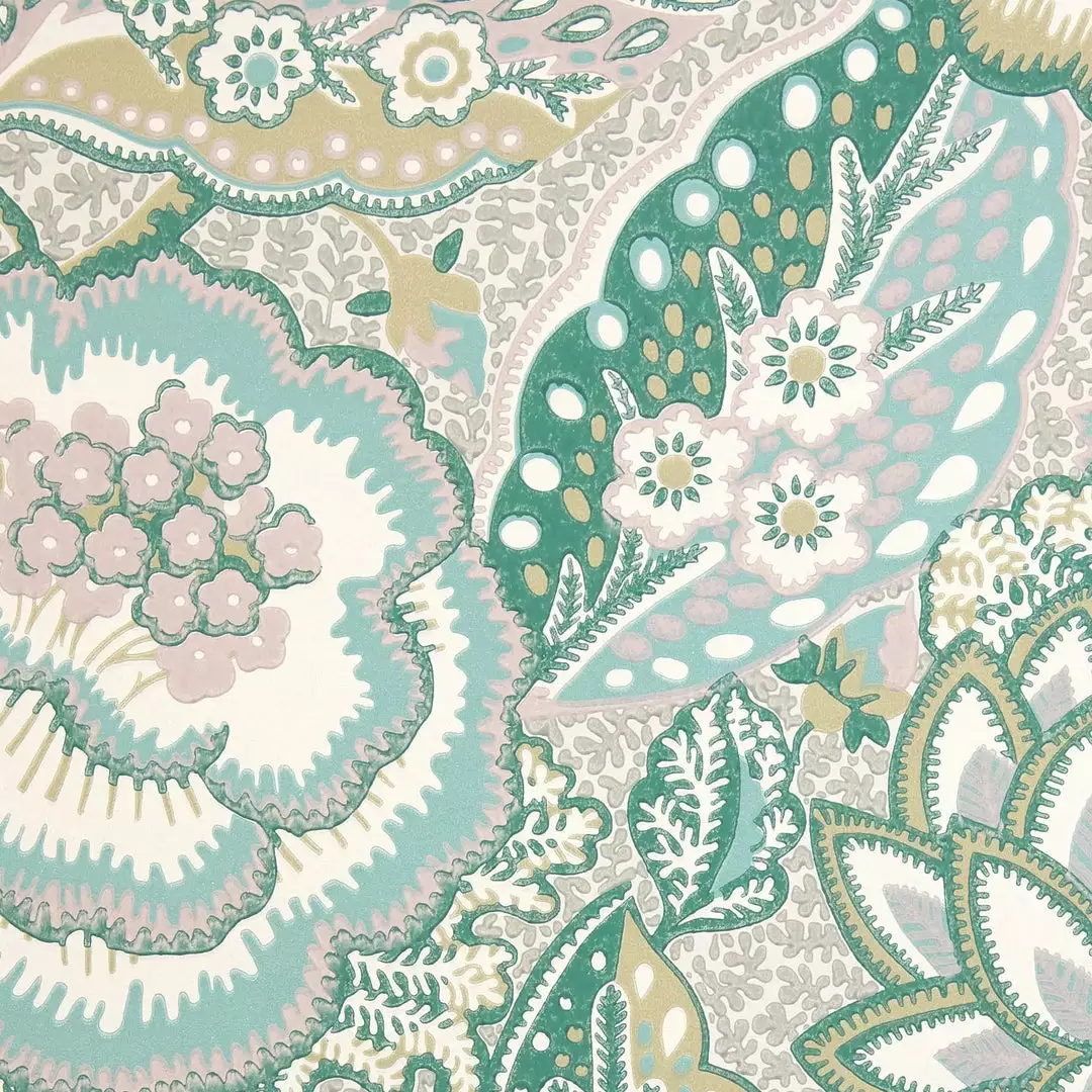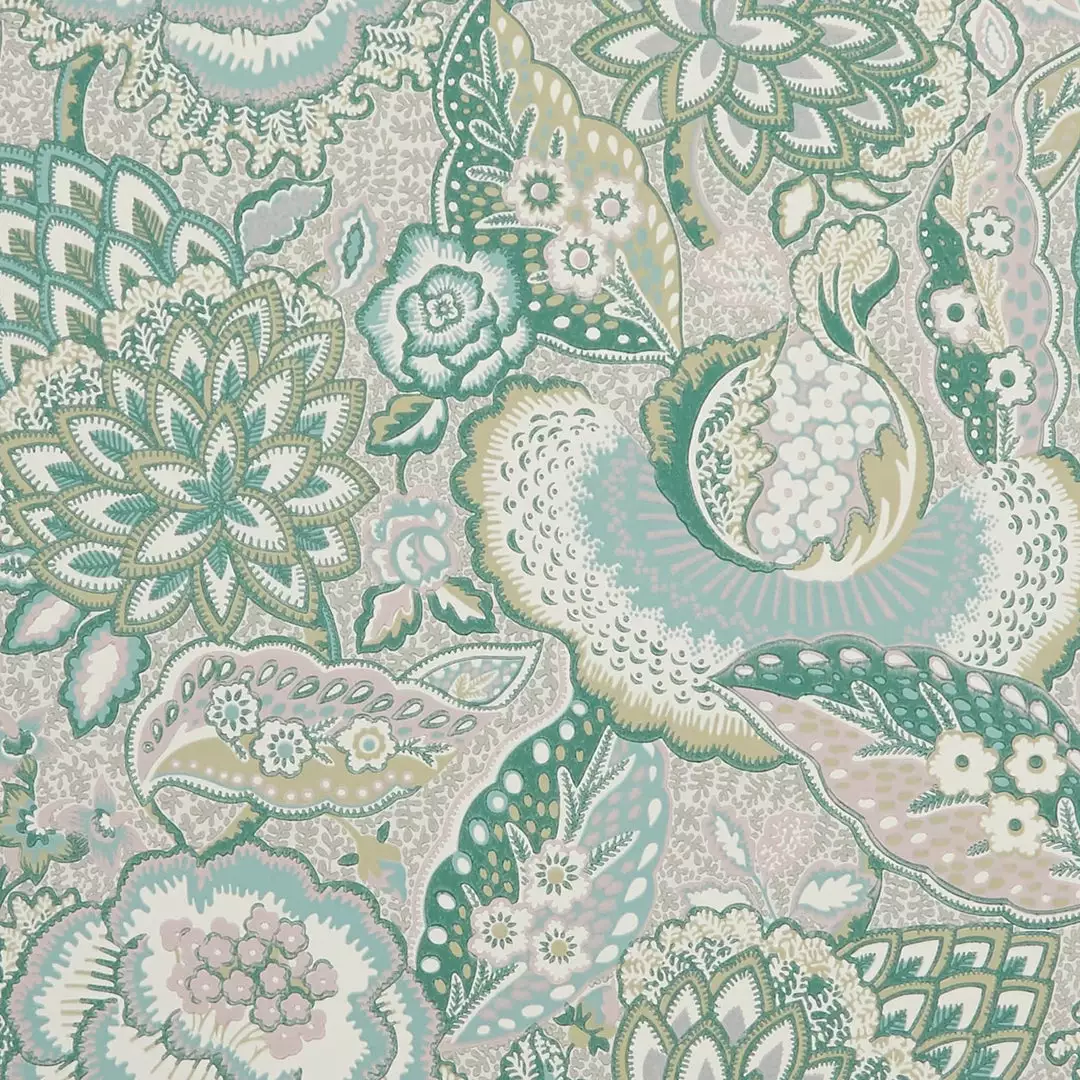 Patricia is a richly stylised and exquisitely detailed floral, created in the 1990s and inspired by the Indian chintz patterns that first came to Europe at the end of the seventeenth century. Patricia appears reimagined as a wallpaper design, using a surface print technique. Its natural matte colour is inspired by plant dyes, sitting alongside soft metallic pigment to provide subtle matte and shine.