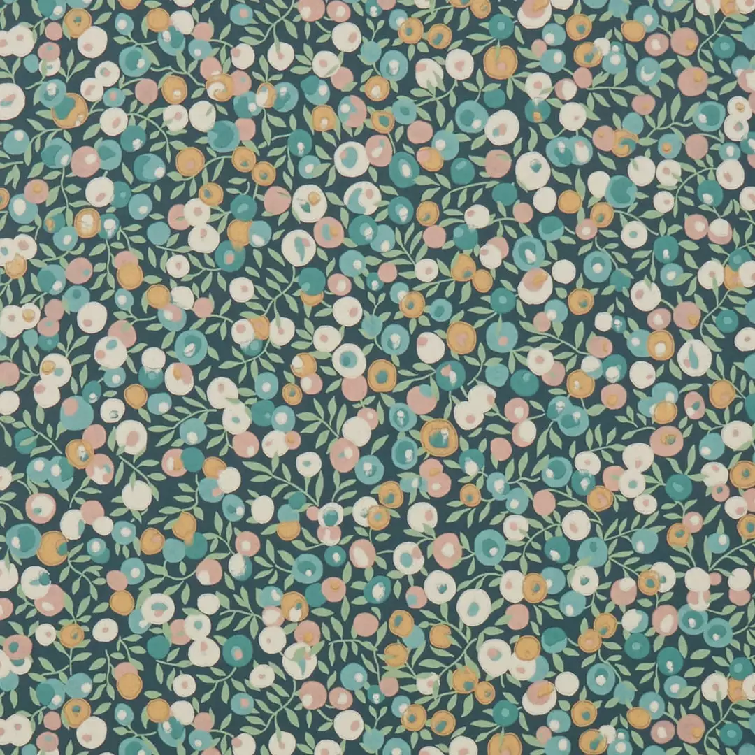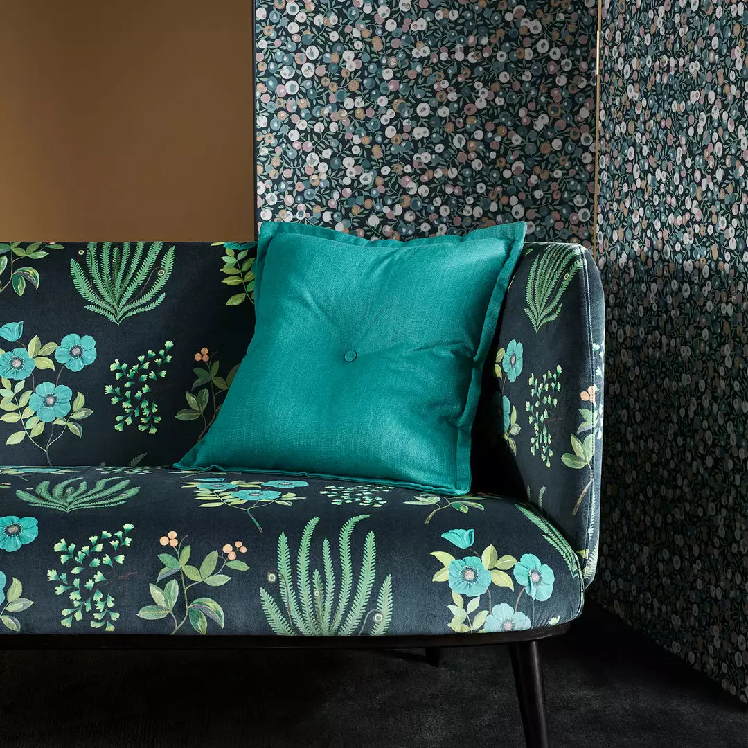 Wiltshire Blossom, the most iconic 1930s leaf-and-berry Liberty print is repainted and re-engineered into a contemporary furnishing design. It is printed using a hybrid technique which allows both flat colour and raised reticulated pigment to sit side by side, providing a beautiful tactility and clarity of print mark, rendered in both matte and metallic pigment.