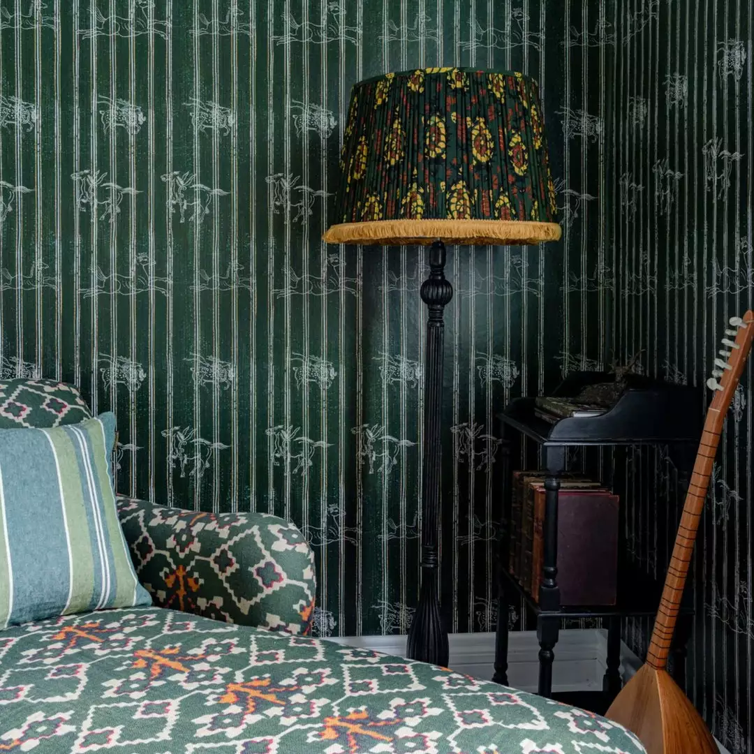 With subtle but intricate details of mystical creatures, A Fable wallpaper tells the story of local legends from once upon a time. Folk Couture at it’s finest. Available in the colourways Alabaster, Evergreen and IndigoÂ