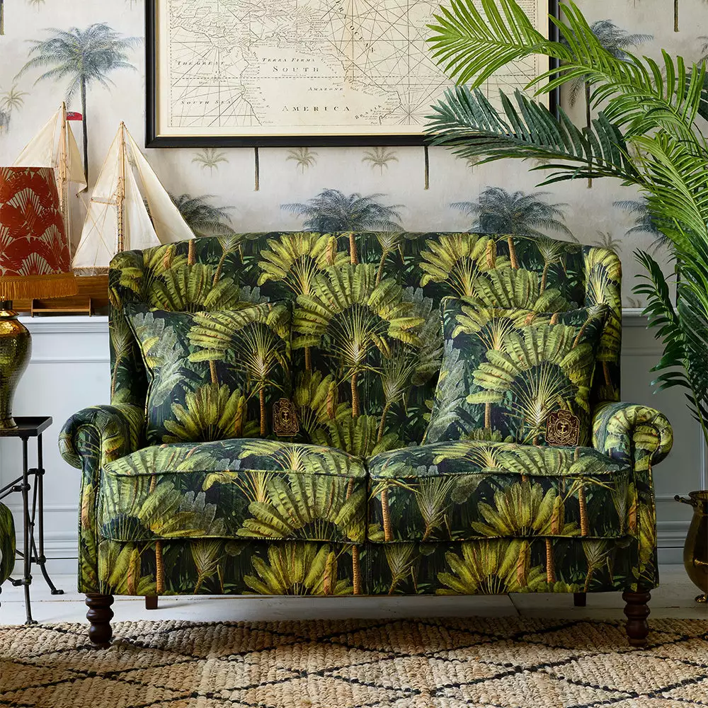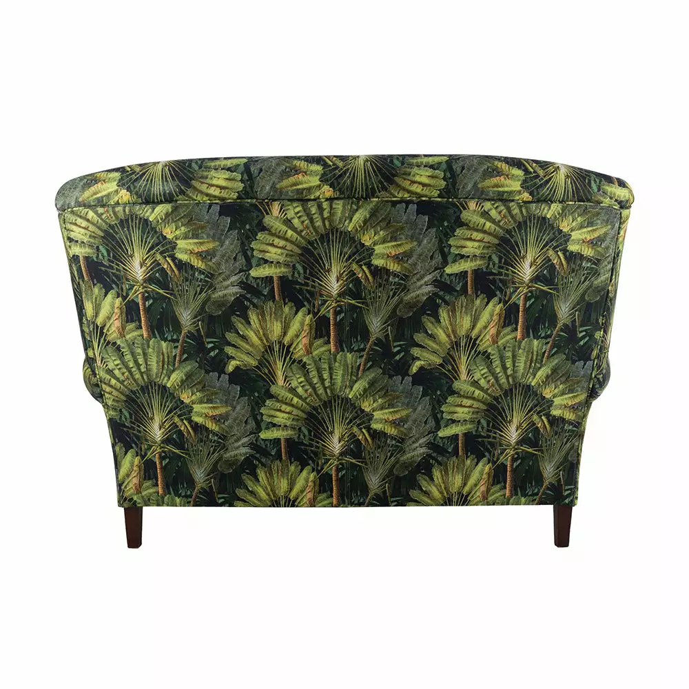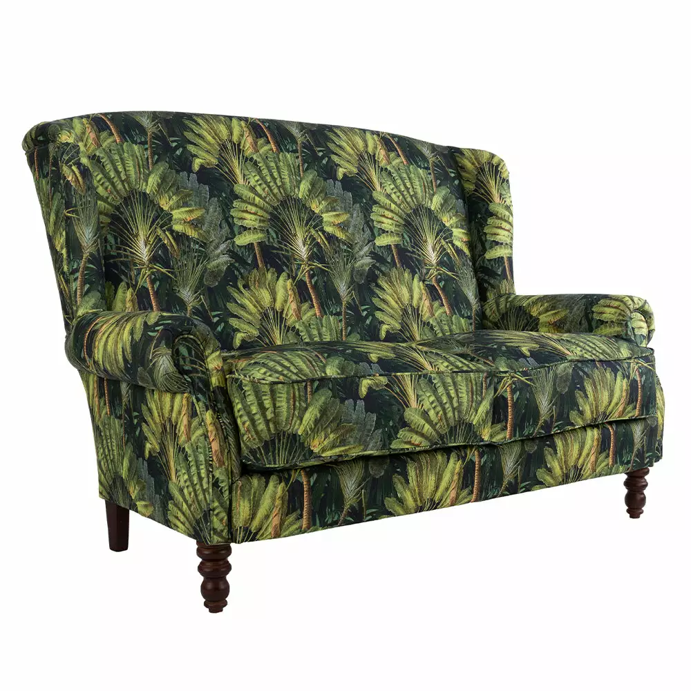 Mind the Gap’s collection of whimsical fabrics continues into this eclectic offering of furniture. This statement two seater sofa is with one piece large upright back , slight rollover arms, and a deep two- cushion seat. Up to date and whimsical in our Traveller’s Palm Linen. Sited on short turned legs. Rich tones of greens and brown highlights. Perfect for the tropical Havana Tropicana look.    Â