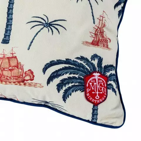 The wonderful island-life details ooze calm holiday vibes through the AEGEAN Linen Cushion design. Printed front and back with the same pattern design, the cushion is finished with a blue border all around and an embroidered marine crest on the lower right corner. The cushion comes with feather filling.