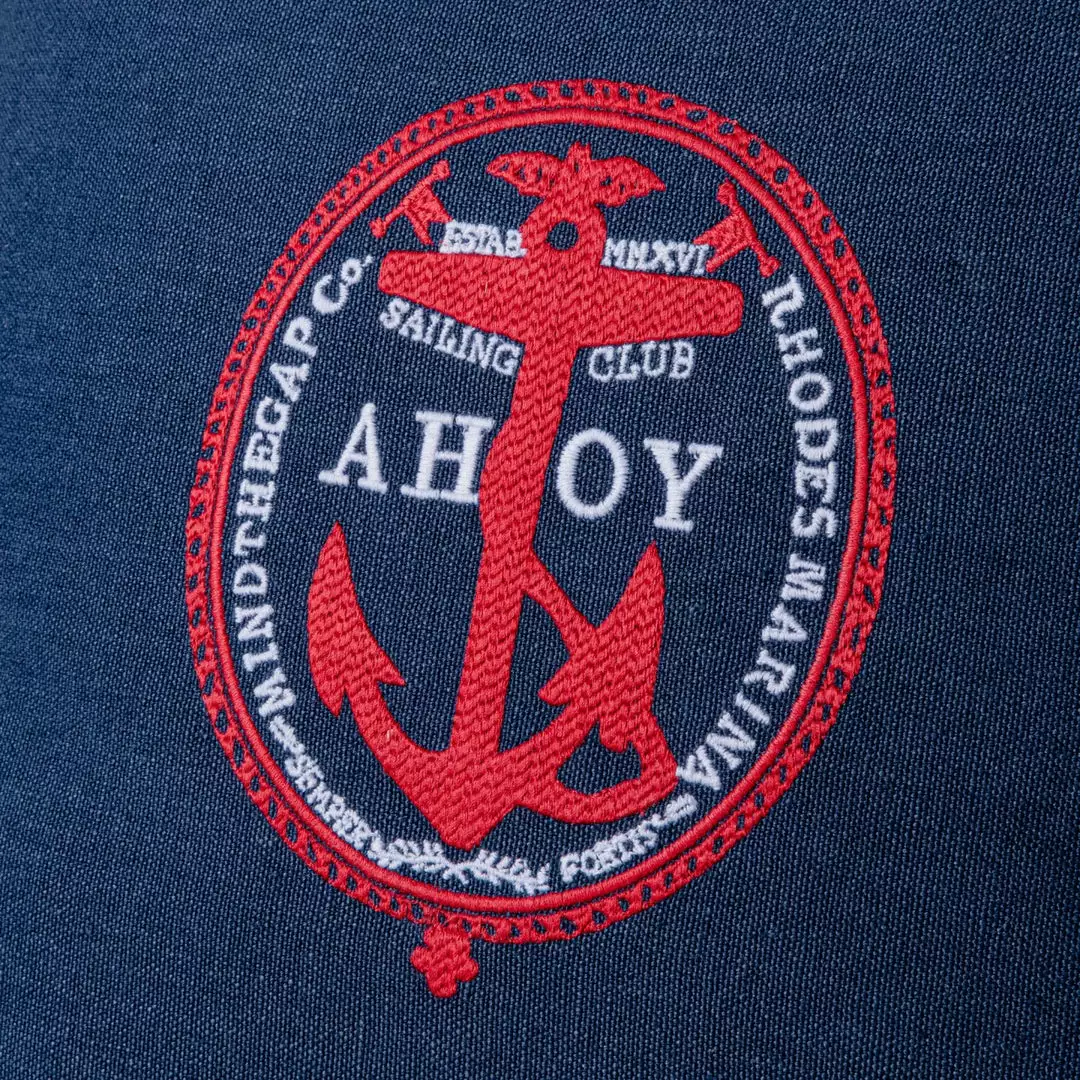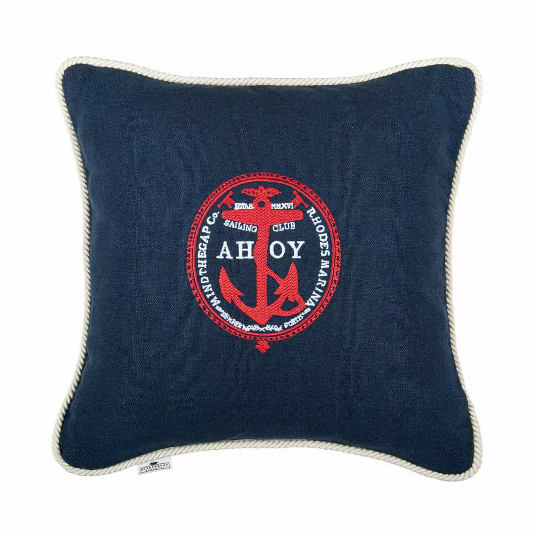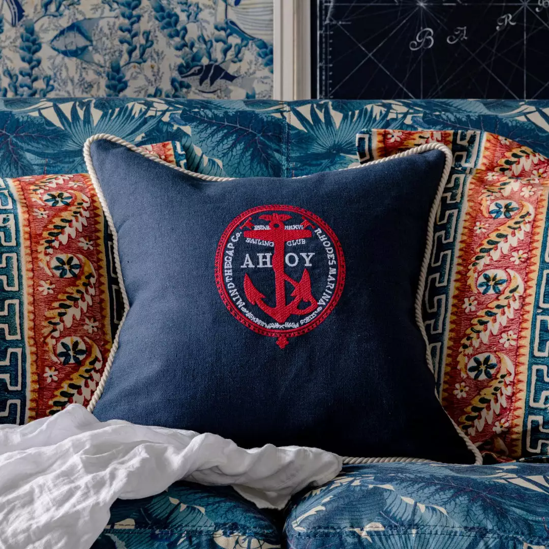 Cheering along the summer vibes from a holiday luxury yacht, the AHOY! Linen Cushion sets a bold statement in deep marine colours. With a large stylish crest embroidery placed over the elegant indigo blue linen, the cushion is finished with an off-white rope border for a marine visual effect. Comes with feather filling.