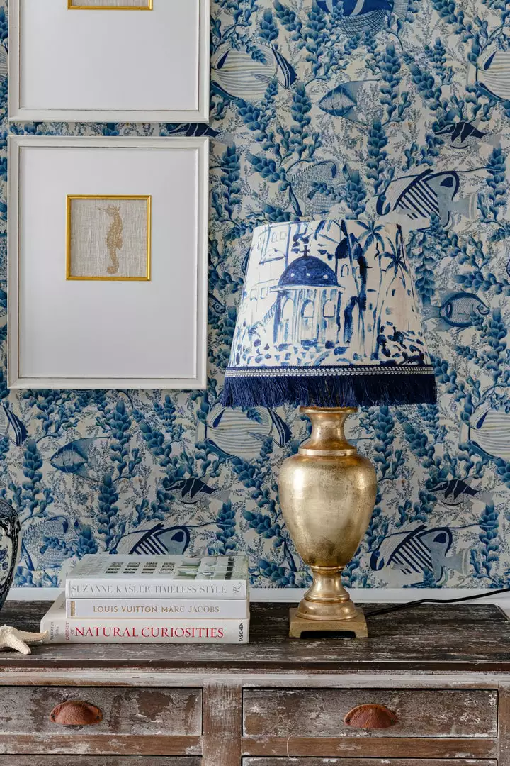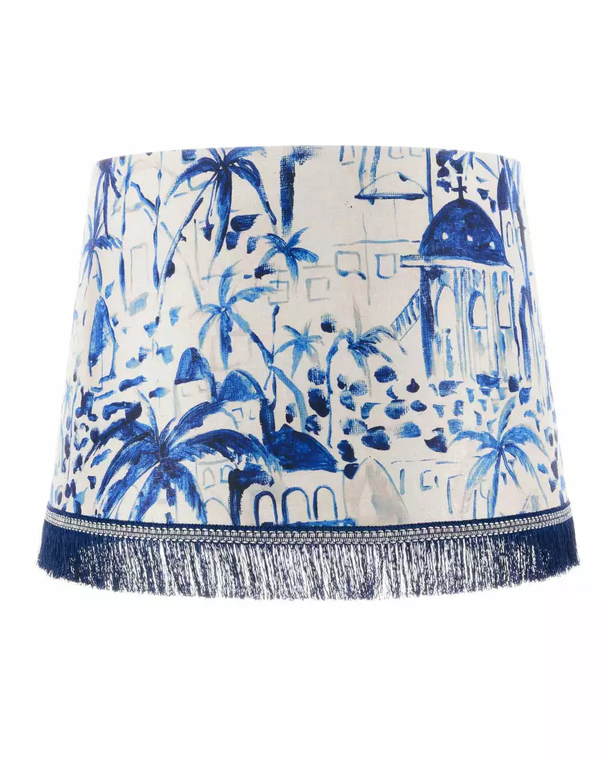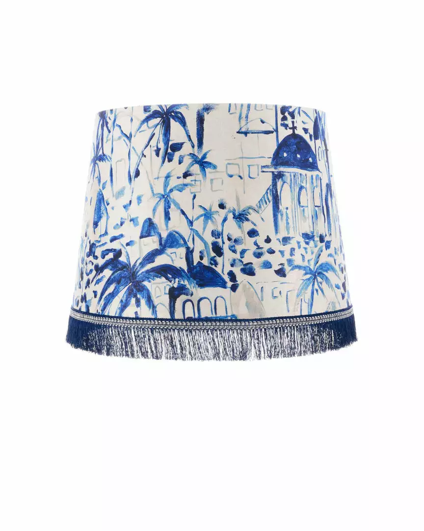 Summer vibes come through the stylish palm trees and sandy details of this charming lamp made with natural, in typical Greek blue hues. Finished with a gold metallic lining and blue fringes