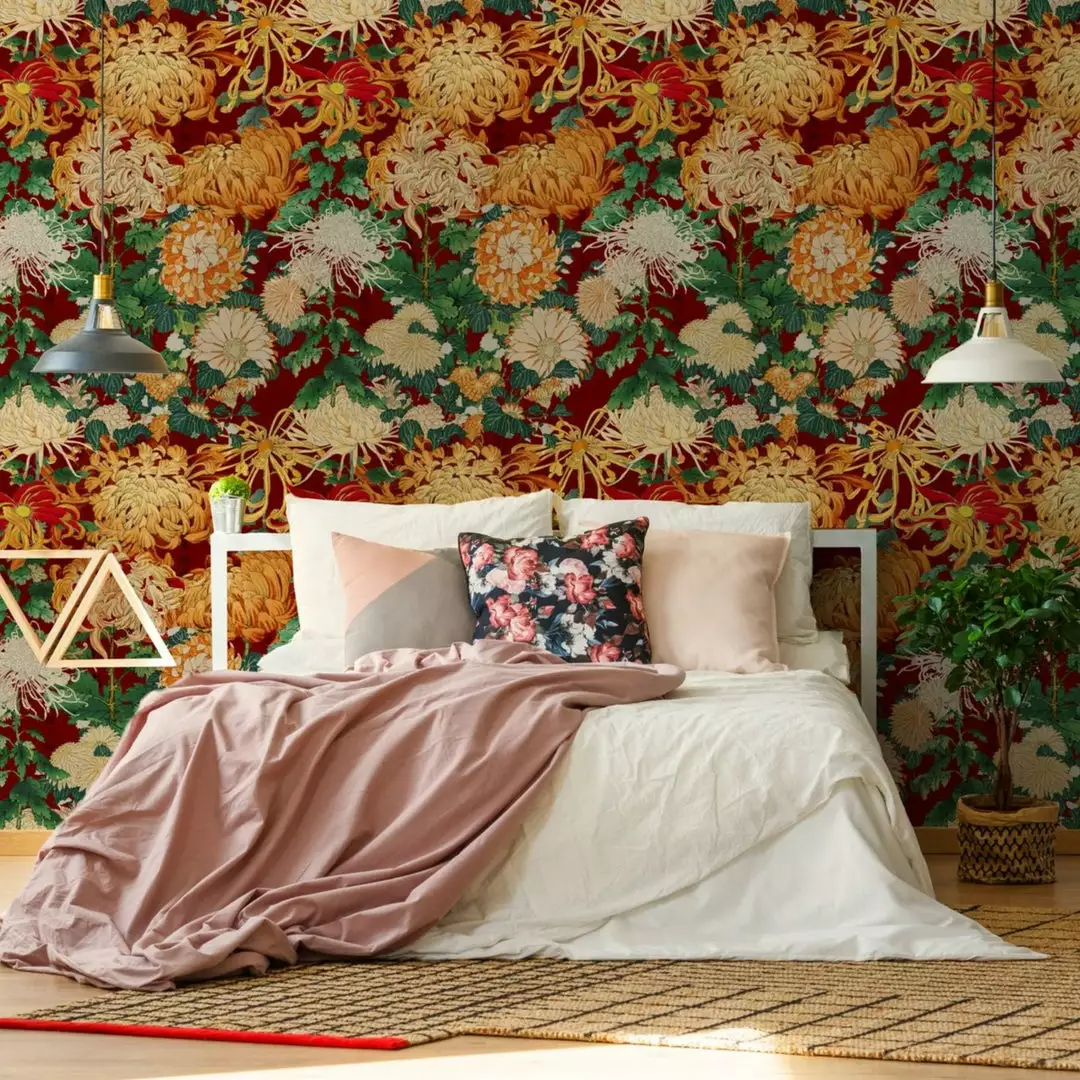 Adorn your walls with the Chrysanthemums wallpaper from Mind The Gap. Bring the outside in and surround yourself with beautiful Chrysanthemums, the perfect statement wallpaper for any home. Inspired by Japanese traditional floral patterns. Easy to put up with the paste the wall application and will enhance any room whether it is one wall or all. This wallpaper is digitally printed using eco-friendly inks. Available in both red and yellow backgrounds.