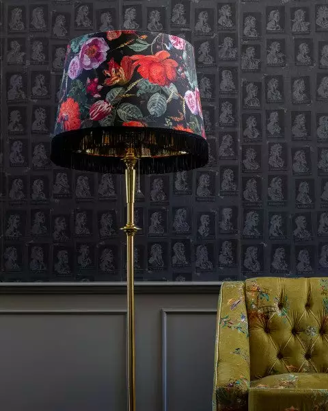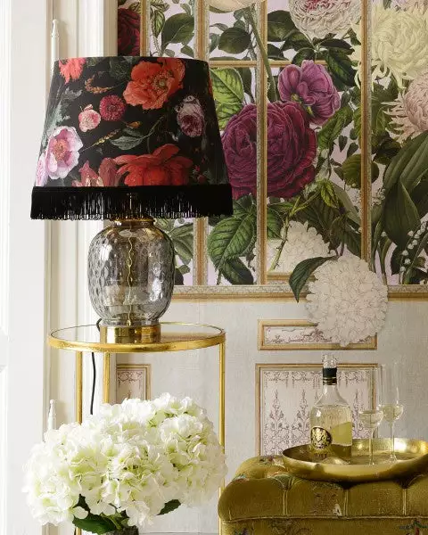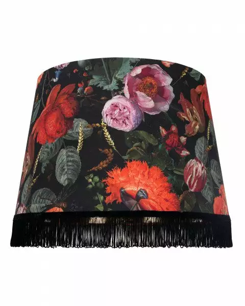 A central item of the Transylvanian Manor look, this floral painterly design comes in natural linen with lush floral adornments. Luxe and mysterious, finished with gold lining and black looped fringesÂ