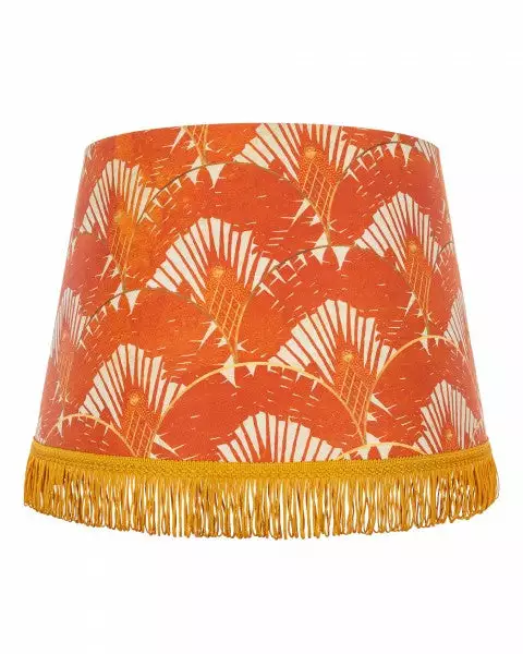 An abstract palm tree print of rich orange hues against a linen background. Finished with gold metallic lining and edged with golden looped fringes.Â