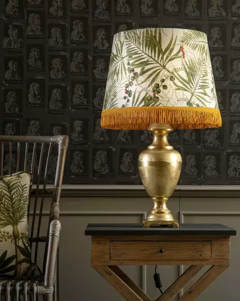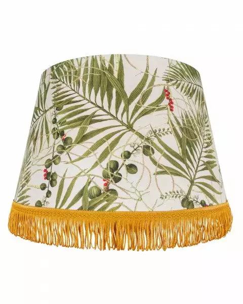 Exotic palms and vegetation with pops of berries for added colour against beige linen. Clean and crisp, finished with gold metallic lining and golden looped fringes