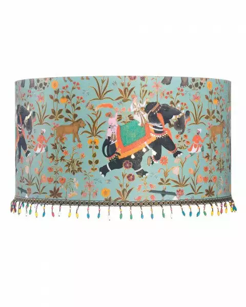 A fun and whimsical print, sacred Elephants, lions and blooms dance against the beautiful aquamarine backdrop. Colourful pops of brightness light up the sky with a metallic gold lining and colourful beaded trim .Â