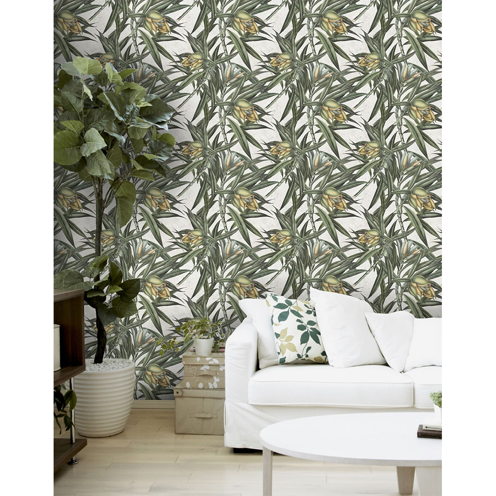 An exotic arrangement of tropical leaves and fruits in the Exotic Fruits II wallpaper from Mind The Gap. It is easy to put up with the paste the wall application and will add a bit of quirk to any room whether it is one wall or all.Â