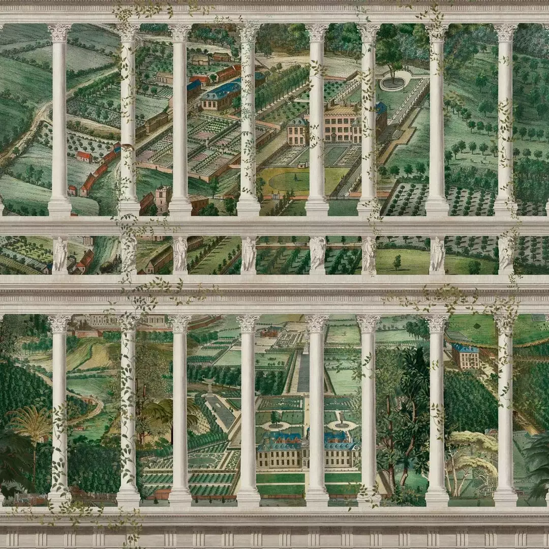 Adorn your walls with the beautiful Fairyland wallpaper from Mind The Gap. An enchanting hand-painted landscape featuring the luscious countryside, seen through the architectural columns surrounding the manor. A gorgeous statement wallpaper to make an impactful feature in any room. Easy to put up with the paste the wall application and will enhance any room whether it is one wall or all. This wallpaper is digitally printed using eco-friendly inks. Printed across three rolls to maximise the repeat pattern and create the feeling of viewing rolling hills and countryside right outside your window.Â