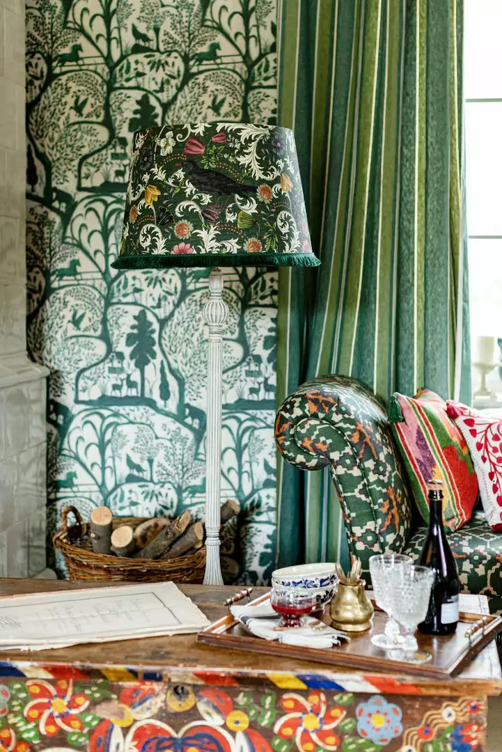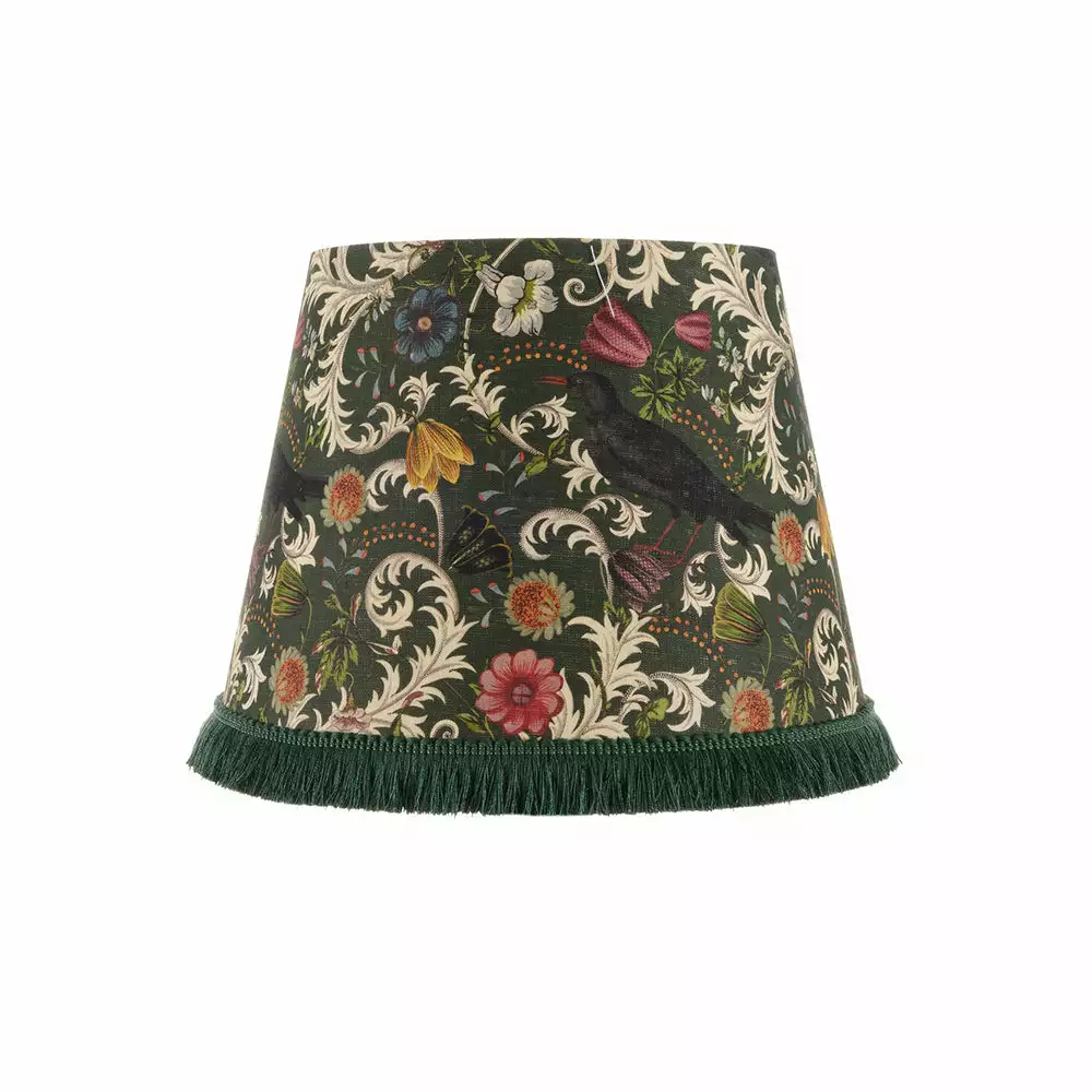 Rich Saxon vibes breeze through this printed linen cone shade, with the blackbird as a statement symbol on the top of an abundant flowery background. Finished with green fringes and golden metallic lining. Part of the Transylvanian Roots collection. Folk Couture at it’s finest.