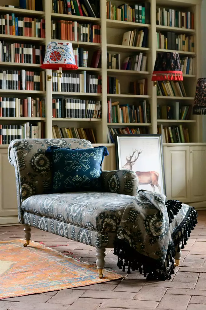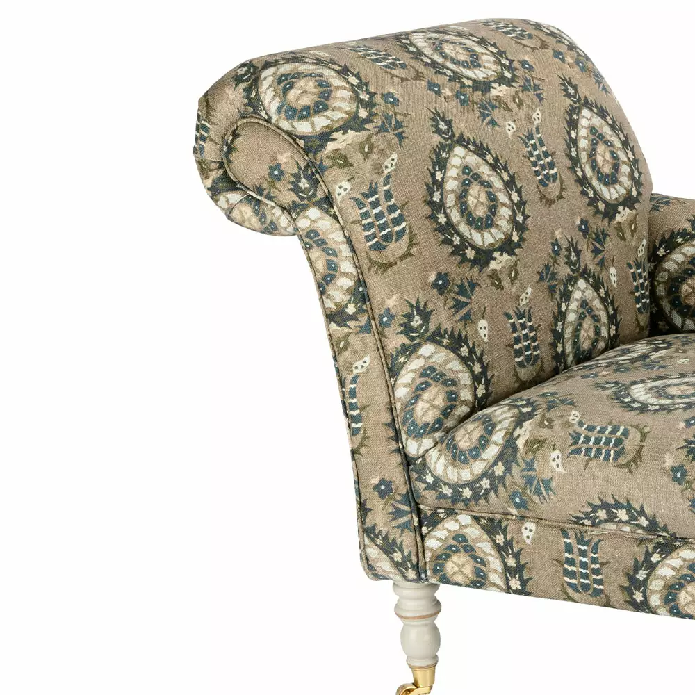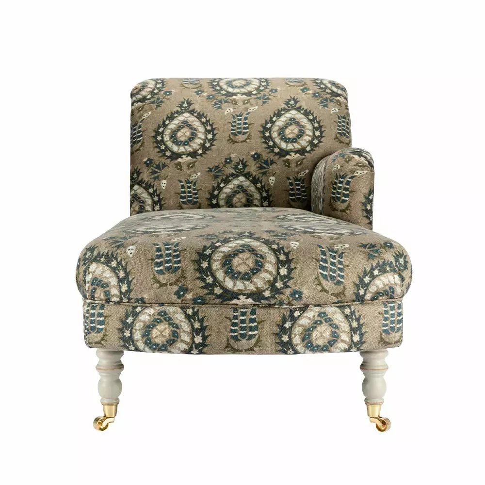 Mind the Gap’s collection of whimsical fabrics continues into this eclectic offering of furniture. The Anatolia Chaise in the rich taupe and blue Flourish Dapple 100% linen fabric.Â