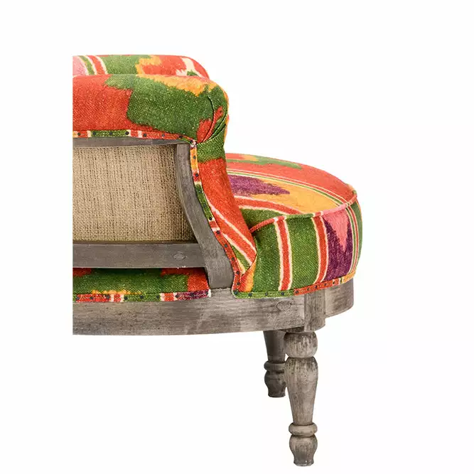Mind the Gap’s collection of whimsical fabrics continues into this eclectic offering of furniture. Fit for royalty the Deconstructed low seating chair with beech wooden open back, upholstered in Erdely Linen fabric. Even more opulent as a pair. Â Â