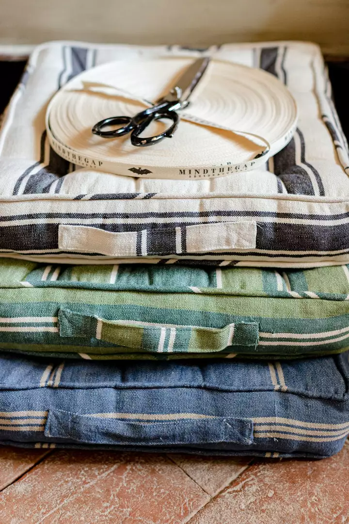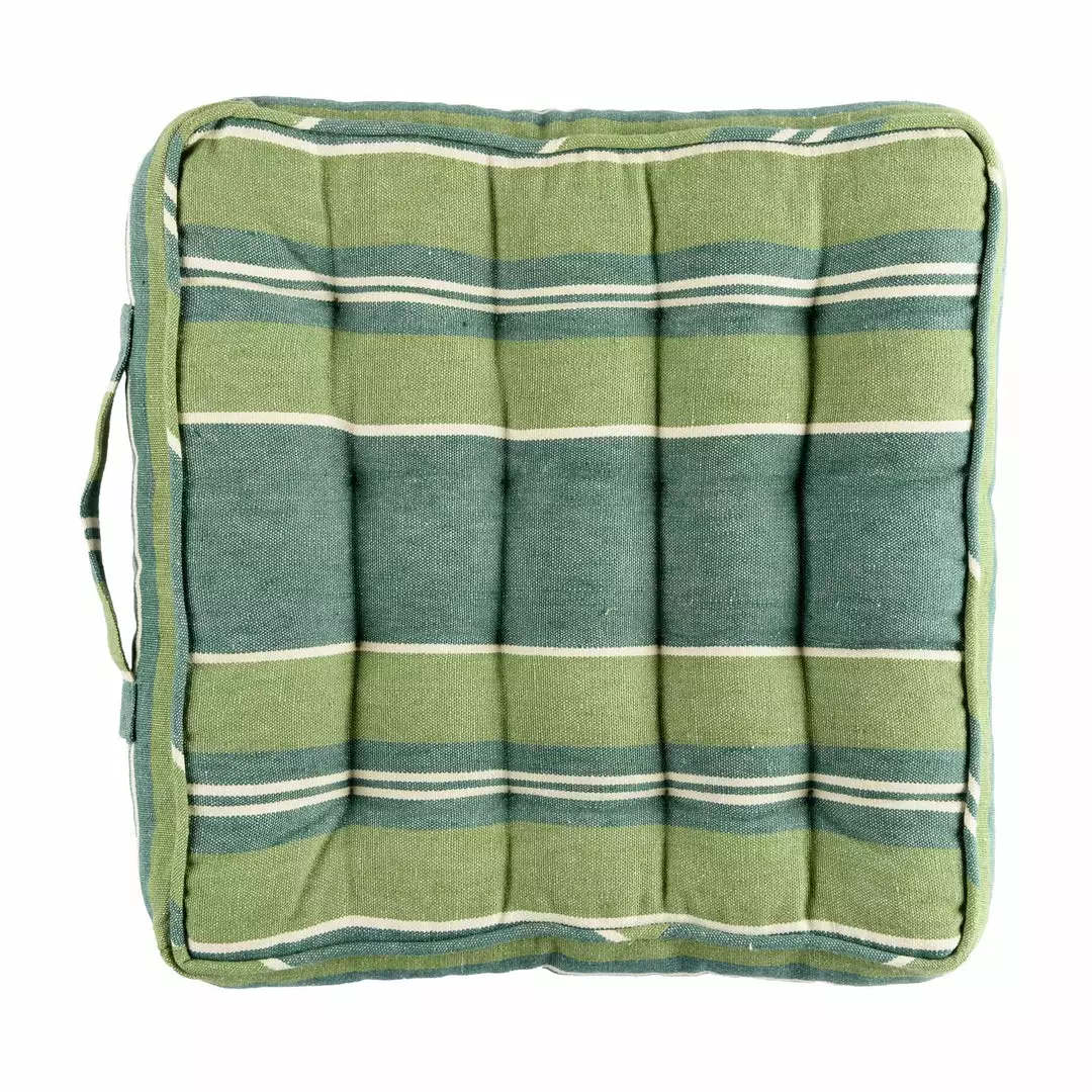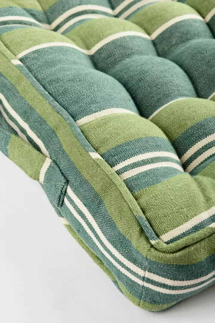 A beautiful Armenian origin stripe of rich greens. Hand sewn and finished with a self fabric piped edge and linen handle. Filled with thick poly foam insert and polyester cove for a long lasting shape.Â