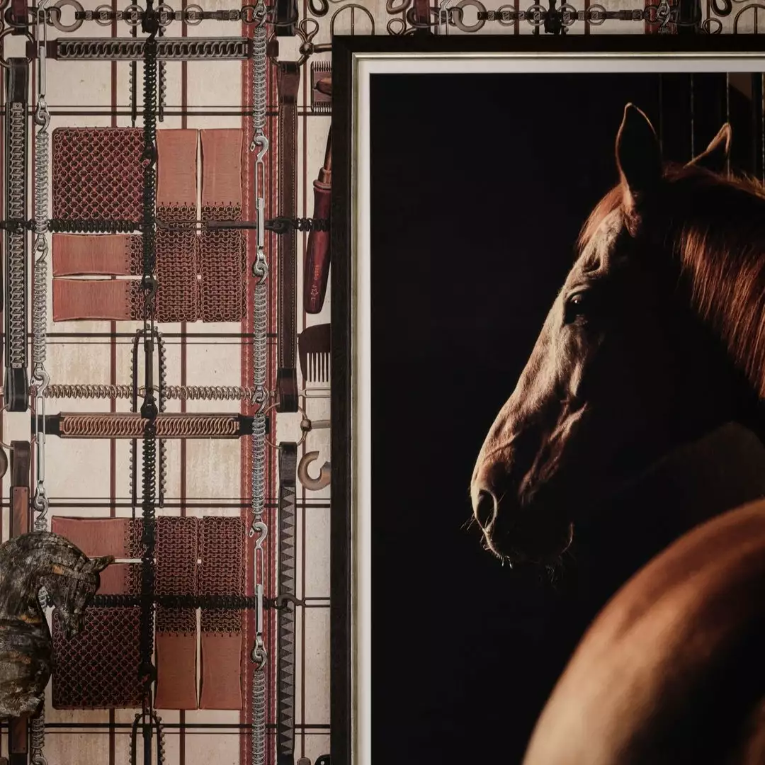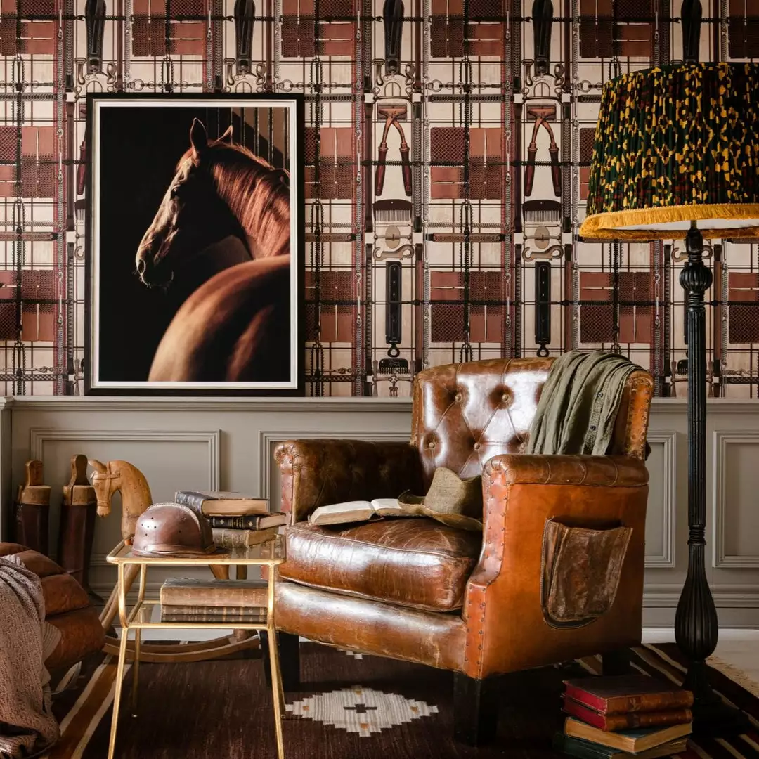 Surround yourself with the impactful Harnessmaker’s Atelier wallpaper from Mind The Gap. Inspired by the iconic tartan print, this design features tools and objects found in the atelier of a harnessmaker. Each beautifully illustrated object is decorated with soft metallic tones to bring them to life. Available in both dark and light. Easy to put up with the paste the wall application and will add a bit of quirk to any room whether it is one wall or all. This wallpaper is digitally printed using eco-friendly inks.Â