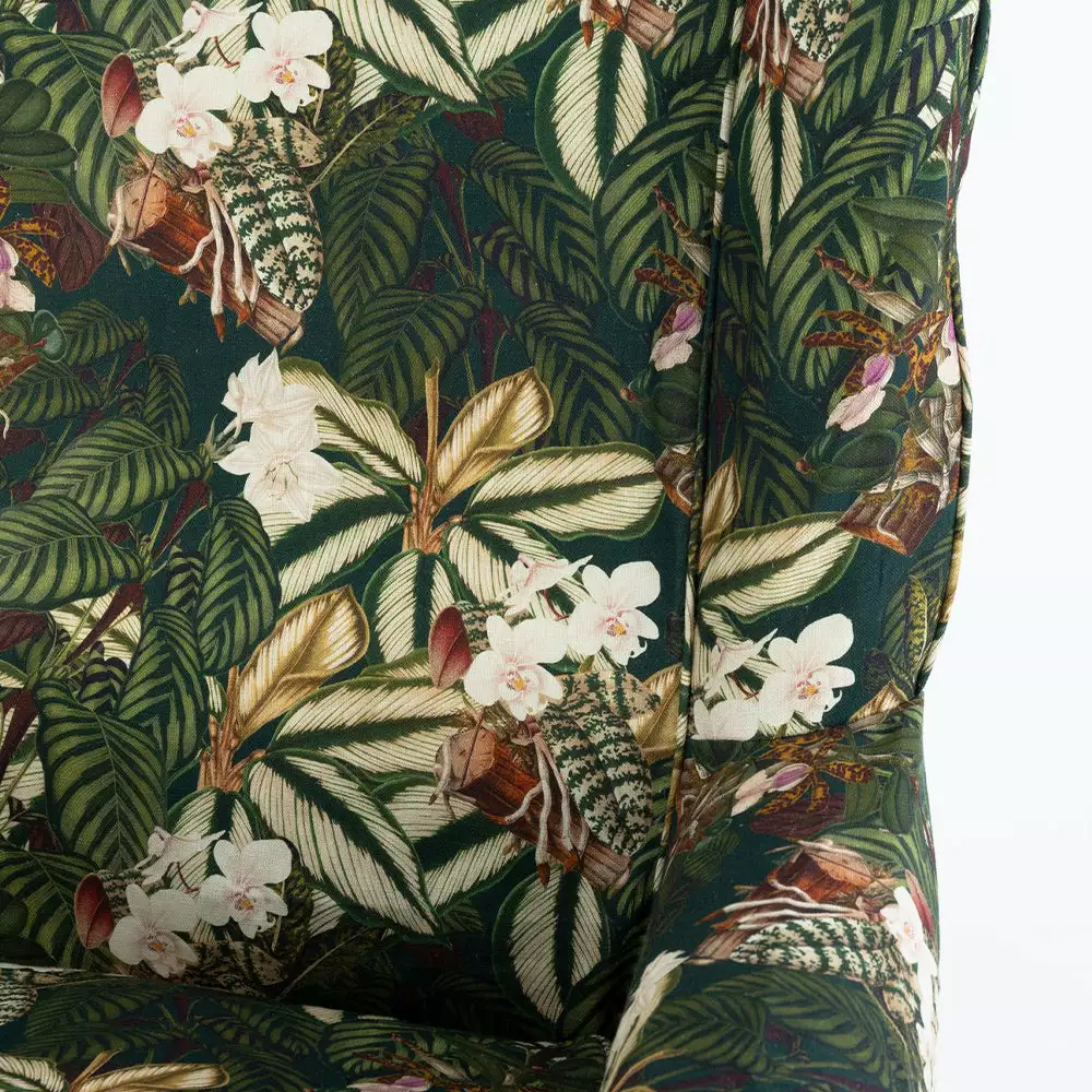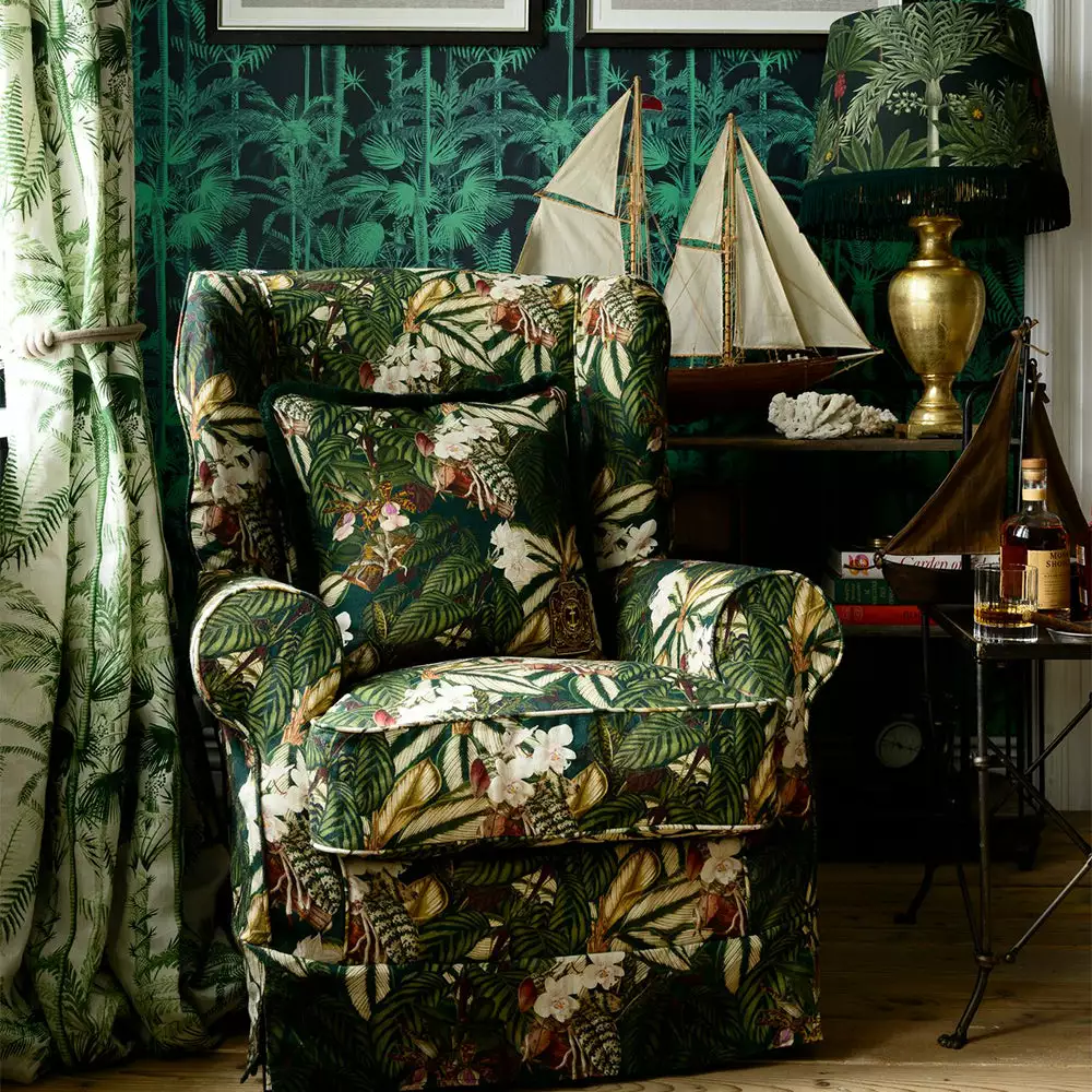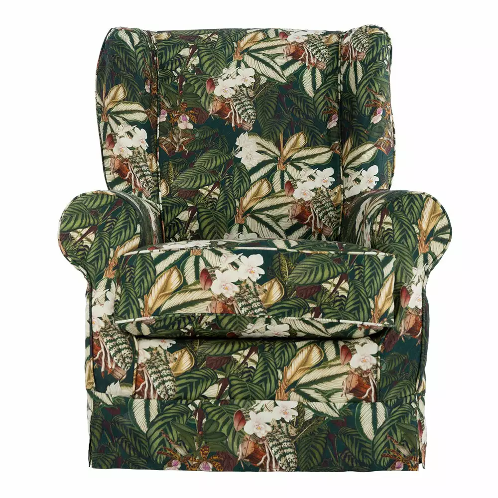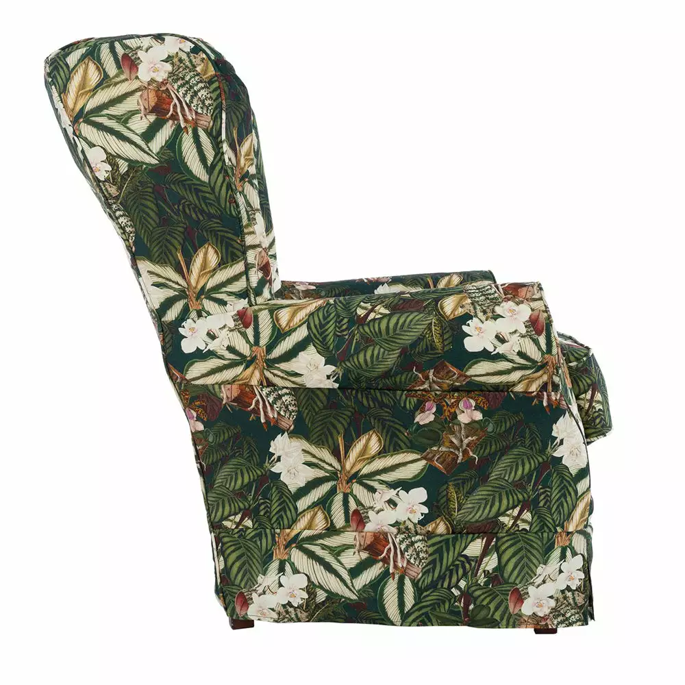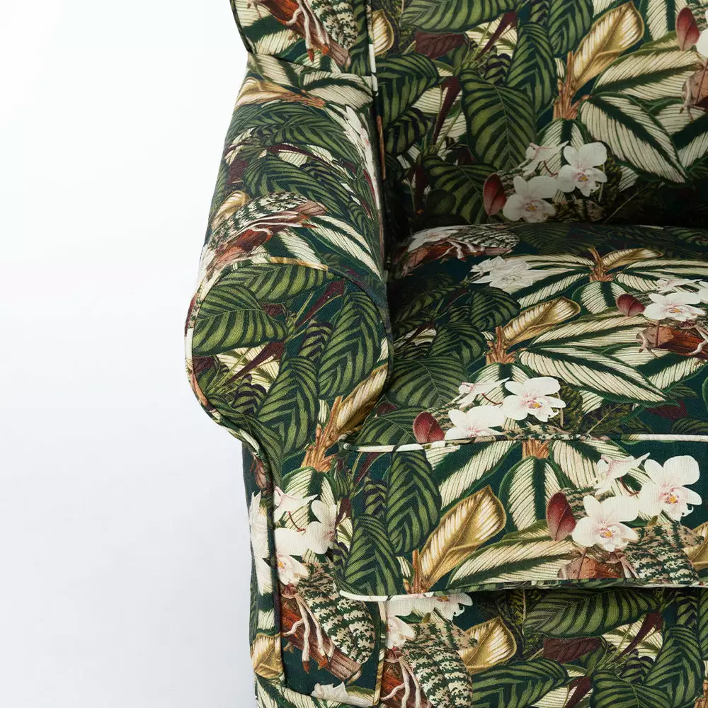 Mind the Gap’s collection of whimsical fabrics continues into this eclectic offering of furniture. Here the Neo-classic armchair silhouette is updated with bloom linen. A comfortable wing backed and rollover arms with cushioned seating. Sited on beechwood structure and tapered short legs. Upholstered with skirted cover.
