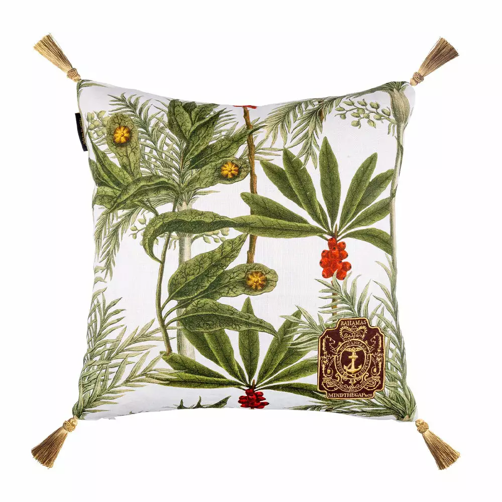 A delicate design on a white background featuring the rainforest of Madagascar . Natural linen finished with buccaneer’s patch , tassels and 100% duck feather filling. Â