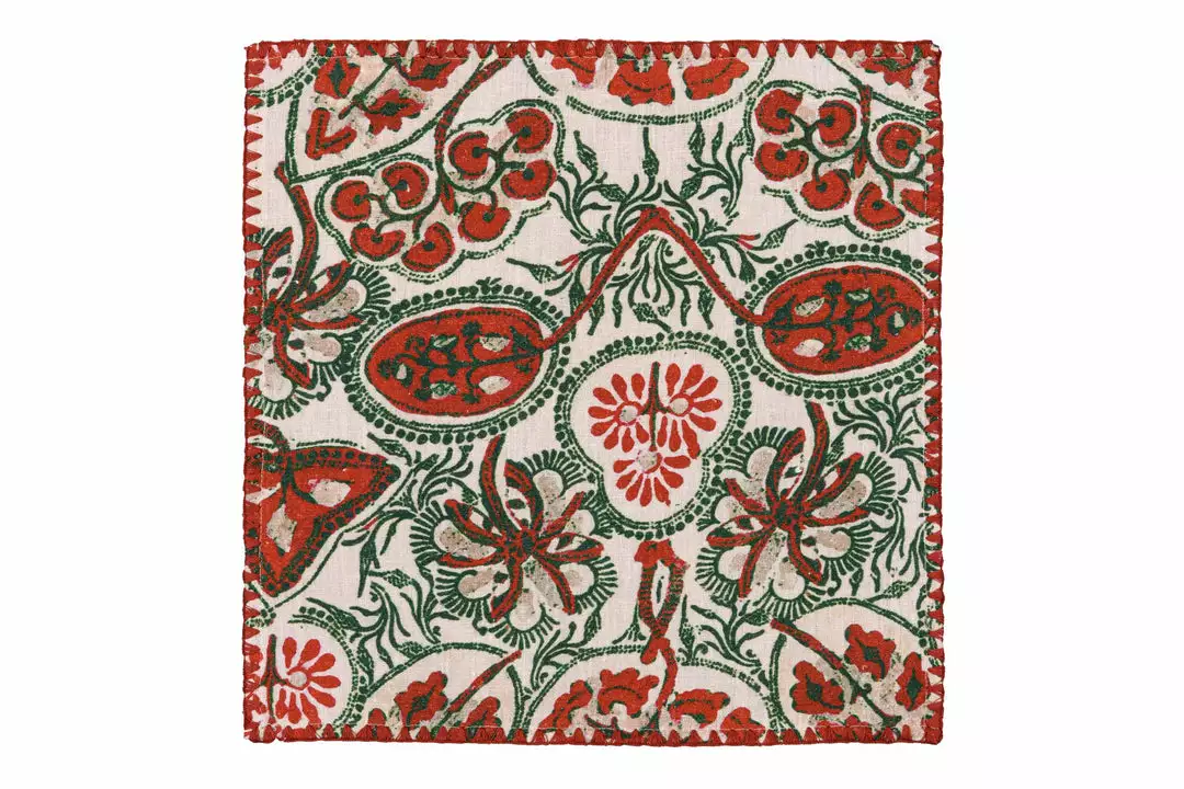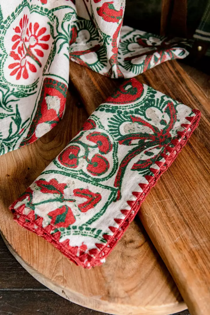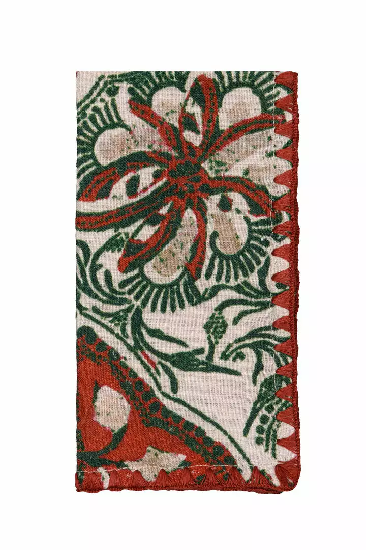 Fine linen fabric 210 gsm., carefully printed and tailored, benefits of a soft-washing treatment to obtain a delicate touch. This stonewashed napkin is completed by a red scallop detailed crochet trimming, acting as a statement finish to this precious item.