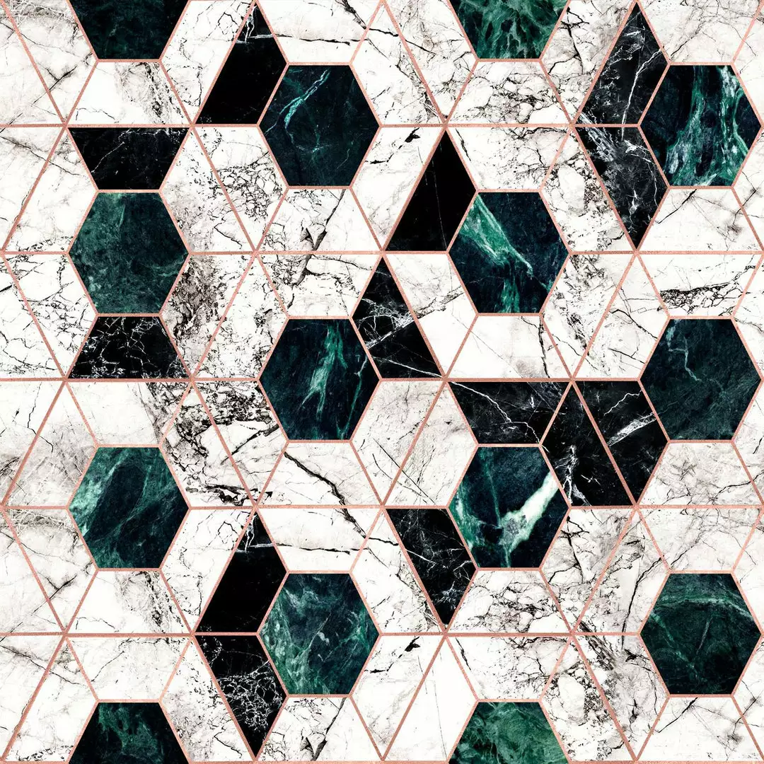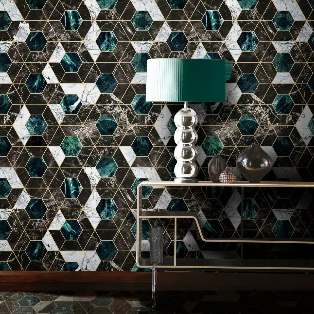 Make a statement with the Hexa wallpaper from Mind The Gap. Featuring a gorgeous large-scale contemporary, geometrical print with jade and marble accents. An impactful feature for any home. Printed on metallic foil. Easy to put up with the paste the wall application and will enhance any room whether it is one wall or all. This wallpaper is digitally printed using eco-friendly inks.