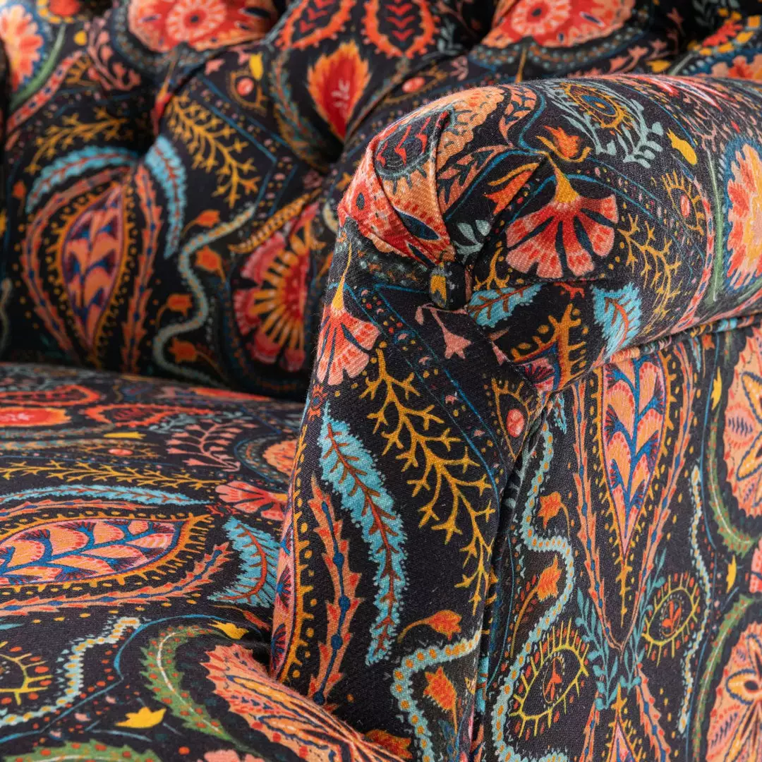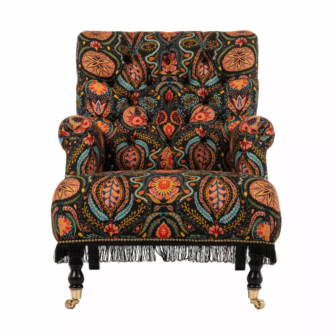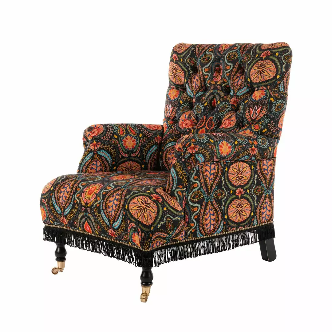 A statement low seat chair, HUDSON features a stylish buttoned back combined with slightly rolled arms and deep comfortable seater. Finished with beautiful, vintage style gold castor front legs, the chair achieves a more authentic look through its carefully selected black fringes secured with brass rivets. Finished with looped fringing.Â